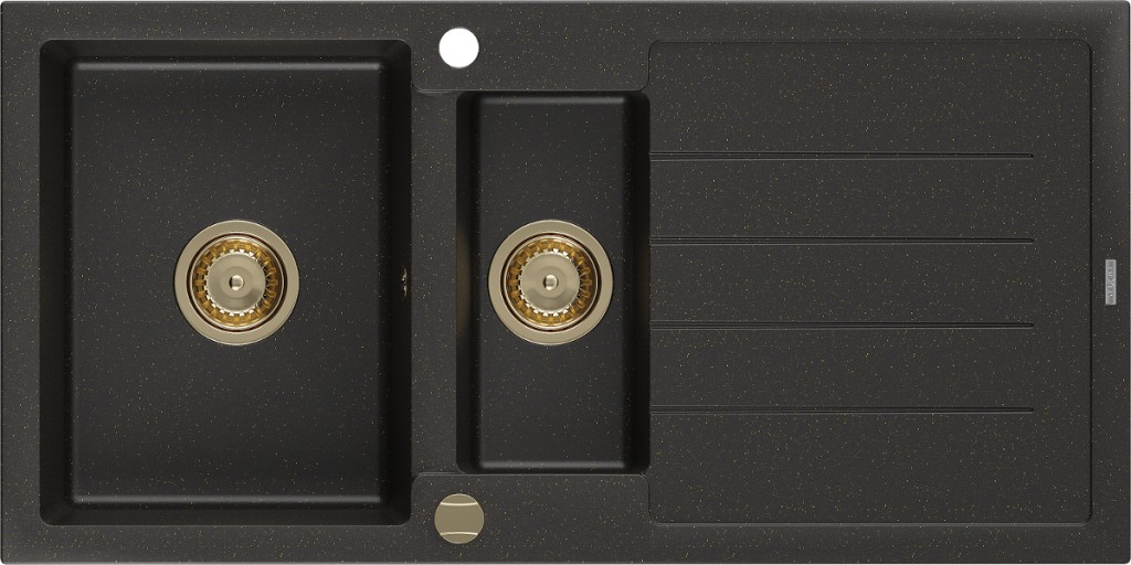 Technické dáta: Rozmer: 1000x500x200 mm Hĺbka komory: 190 mm (väčšia), 115 mm (menšia) Rozmery komory: 430x330 mm (väčšie), 340x170 mm (menšie) Priemer odtoku: ø90 mm Typ: 1,5-miska s odkvapkávačom Typ: Zapustené do pracovnej dosky Materiál: žula Farba: čierna / zlatá metalíza Povrchová úprava sifónu: zlatá Prepadový otvor: Áno Otvor pre batériu: Áno Vrátane automatického sifónu Vysoká odolnosť proti poškriabaniu a zmene farby Odolnosť proti tepelným šokom Povrch pre ľahké čistenie(GT) Ean: 5905315012296