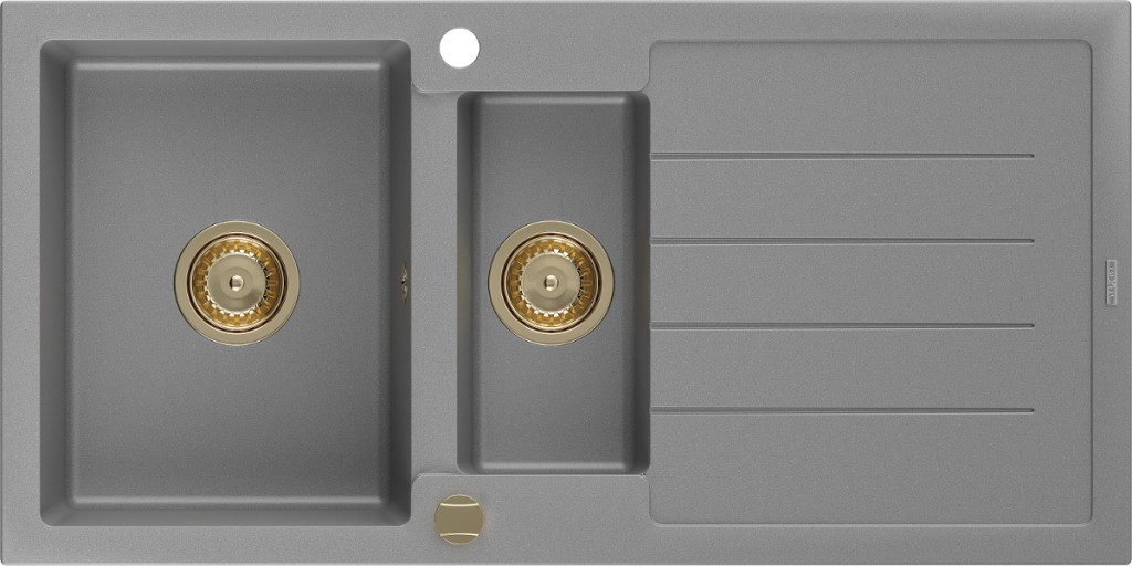 Technické dáta: Rozmer: 1000x500x200 mm Hĺbka komory: 190 mm (väčšia), 115 mm (menšia) Rozmery komory: 430x330 mm (väčšie), 340x170 mm (menšie) Priemer odtoku: ø90 mm Typ: 1,5-miska s odkvapkávačom Typ: Zapustené do pracovnej dosky Materiál: žula Šedá farba Povrchová úprava sifónu: zlatá Prepadový otvor: Áno Otvor pre batériu: Áno Vrátane automatického sifónu Vysoká odolnosť proti poškriabaniu a zmene farby Odolnosť proti tepelným šokom Povrch pre ľahké čistenie(GT) Ean: 5905315012272