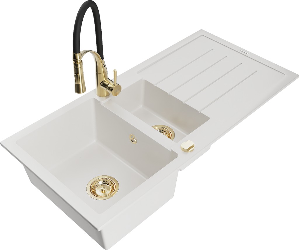 Technické údaje: Kuchynský drez: Rozmer: 1000x500x200 mm Hĺbka komory: 190 mm (väčšia), 115 mm (menšia) Rozmery komory: 430x330 mm (väčšie), 340x170 mm (menšie) Priemer odtoku: ø90 mm Typ: 1,5-miska s odkvapkávačom Typ: Zapustené do pracovnej dosky Farba: Biela Povrchová úprava sifónu: zlatá Materiál: žula (80% žulové kamenivo 20% živice) Prepadový otvor: Áno Otvory: (batérie, automat) 2 Inštalácia: Univerzálna, je možné inštalovať s odkvapkávačom na ľavú alebo pravú stranu Vysoká odolnosť proti poškriabaniu a zmene farby Odolnosť proti tepelným šokom Povrch pre ľahké čistenie Dva dodatočné vyfrézované otvory na samodierovanie ø35 Kuchynská batéria: Materiál: mosadz Farba: Zlatá/Čierna Hlava: Keramická Perlátor: Áno Typ výtoku: Flexibilný s mosadzným držiakom Typ: Jednopákové Výška batérie: 430 mm Rozsah výtoku: 235 mm(GT) Ean: 5905315047588