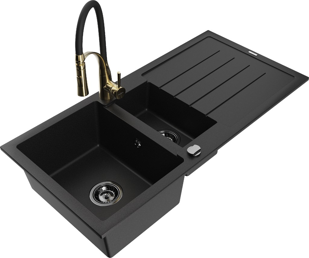 Technické dáta: Drez: Rozmer: 1000x500x200 mm Hĺbka komory: 190 mm (väčšia), 115 mm (menšia) Rozmery komory: 430x330 mm (väčšie), 340x170 mm (menšie) Priemer odtoku: ø90 mm Typ: 1,5-miska s odkvapkávačom Typ: Zapustené do pracovnej dosky Čierna farba Povrchová úprava sifónu: čierna Materiál: žula (80% žulové kamenivo 20% živice) Prepadový otvor: Áno Otvory: (batérie, automat) 2 Inštalácia: Univerzálna, je možné inštalovať s odkvapkávačom na ľavú alebo pravú stranu Vysoká odolnosť proti poškriabaniu a zmene farby Odolnosť proti tepelným šokom Povrch pre ľahké čistenie Dva dodatočné vyfrézované otvory na samodierovanie ø35 Kuchynská batéria: Materiál: mosadz Farba: Zlatá/Čierna Hlava: Keramická Perlátor: Áno Typ výtoku: Flexibilný s mosadzným držiakom Typ: Jednopákové Výška batérie: 430 mm Rozsah výtoku: 235 mm(GT) Ean: 5905315047953
