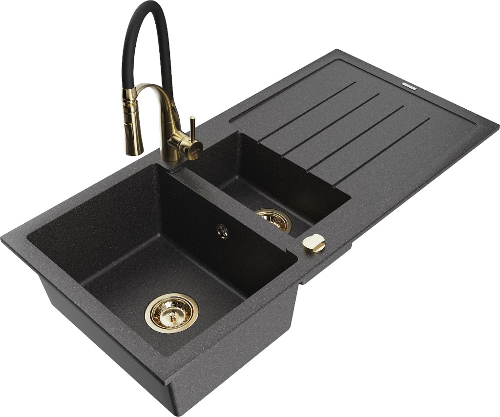 Technické dáta: Drez: Rozmer: 1000x500x200 mm Hĺbka komory: 190 mm (väčšia), 115 mm (menšia) Rozmery komory: 430x330 mm (väčšie), 340x170 mm (menšie) Priemer odtoku: ø90 mm Typ: 1,5-miska s odkvapkávačom Typ: Zapustené do pracovnej dosky Farba: Škvrnitá čierna Povrchová úprava sifónu: zlatá Materiál: žula (80% žulové kamenivo 20% živice) Prepadový otvor: Áno Otvory: (batérie, automat) 2 Inštalácia: Univerzálna, je možné inštalovať s odkvapkávačom na ľavú alebo pravú stranu Vysoká odolnosť proti poškriabaniu a zmene farby Odolnosť proti tepelným šokom Povrch pre ľahké čistenie Dva dodatočné vyfrézované otvory na samodierovanie ø35 Kuchynská batéria: Materiál: mosadz Farba: Zlatá/Čierna Hlava: Keramická Perlátor: Áno Typ výtoku: Flexibilný s mosadznou podperou Typ: Jednopákové Výška batérie: 430 mm Rozsah výtoku: 235 mm(GT) Ean: 5905315047885