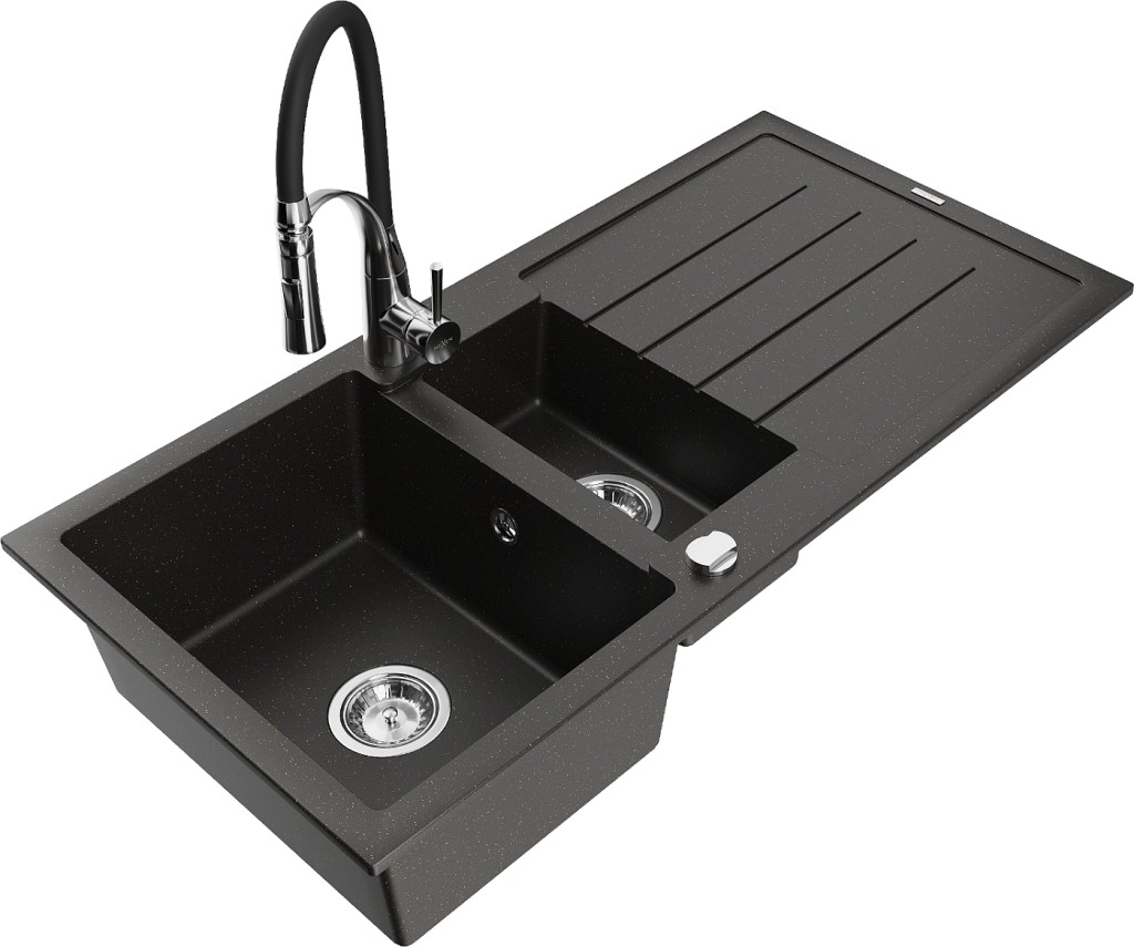 Technické dáta: Drez: Rozmer: 1000x500x200 mm Hĺbka komory: 190 mm (väčšia), 115 mm (menšia) Rozmery komory: 430x330 mm (väčšie), 340x170 mm (menšie) Priemer odtoku: ø90 mm Typ: 1,5-miska s odkvapkávačom Typ: Zapustené do pracovnej dosky Farba: čierna / zlatá metalíza Povrchová úprava sifónu: Chrome Materiál: žula (80% žulové kamenivo 20% živice) Prepadový otvor: Áno Otvory: (batérie, automat) 2 Inštalácia: Univerzálna, je možné inštalovať s odkvapkávačom na ľavú alebo pravú stranu Vysoká odolnosť proti poškriabaniu a zmene farby Odolnosť proti tepelným šokom Povrch pre ľahké čistenie Dva dodatočné vyfrézované otvory na samodierovanie ø35 Kuchynská batéria: Materiál: mosadz Farba: chróm/čierna Hlava: Keramická Perlátor: Áno Typ výtoku: Flexibilný s mosadznou podperou Typ: Jednopáková Výška batérie: 430 mm Rozsah výtoku: 235 mm(GT) Ean: 5905315047809