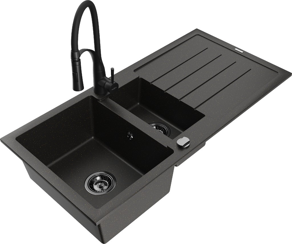 Technické dáta: Drez: Rozmer: 1000x500x200 mm Hĺbka komory: 190 mm (väčšia), 115 mm (menšia) Rozmery komory: 430x330 mm (väčšie), 340x170 mm (menšie) Priemer odtoku: ø90 mm Typ: 1,5-miska s odkvapkávačom Typ: Zapustené do pracovnej dosky Farba: čierna / zlatá metalíza Povrchová úprava sifónu: čierna Materiál: žula (80% žulové kamenivo 20% živice) Prepadový otvor: Áno Otvory: (batérie, automat) 2 Inštalácia: Univerzálna, je možné inštalovať s odkvapkávačom na ľavú alebo pravú stranu Vysoká odolnosť proti poškriabaniu a zmene farby Odolnosť proti tepelným šokom Povrch pre ľahké čistenie Dva dodatočné vyfrézované otvory na samodierovanie ø35 Kuchynská batéria: Materiál: mosadz Čierna farba Hlava: Keramická Perlátor: Áno Typ výtoku: Flexibilný s mosadznou podperou Typ: Jednopáková Výška batérie: 430 mm Rozsah výtoku: 235 mm(GT) Ean: 5905315047847