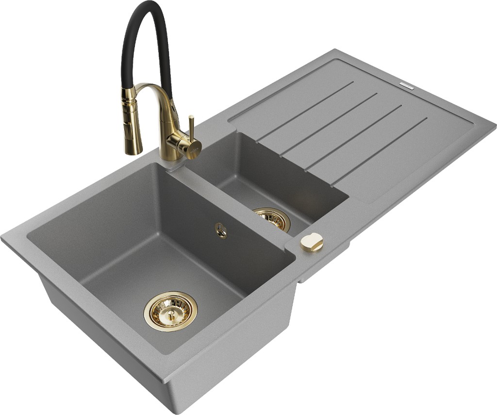 Technické dáta: Drez: Rozmer: 1000x500x200 mm Hĺbka komory: 190 mm (väčšia), 115 mm (menšia) Rozmery komory: 430x330 mm (väčšie), 340x170 mm (menšie) Priemer odtoku: ø90 mm Typ: 1,5-miska s odkvapkávačom Typ: Zapustené do pracovnej dosky Šedá farba Povrchová úprava sifónu: zlatá Materiál: žula (80% žulové kamenivo 20% živice) Prepadový otvor: Áno Otvory: (batérie, automat) 2 Inštalácia: Univerzálna, je možné inštalovať s odkvapkávačom na ľavú alebo pravú stranu Vysoká odolnosť proti poškriabaniu a zmene farby Odolnosť proti tepelným šokom Povrch pre ľahké čistenie Dva dodatočné vyfrézované otvory na samodierovanie ø35 Kuchynská batéria: Materiál: mosadz Farba: Zlatá/Čierna Hlava: Keramická Perlátor: Áno Typ výtoku: Flexibilný s mosadznou podperou Typ: Jednopákové Výška batérie: 430 mm Rozsah výtoku: 235 mm(GT) Ean: 5905315047700