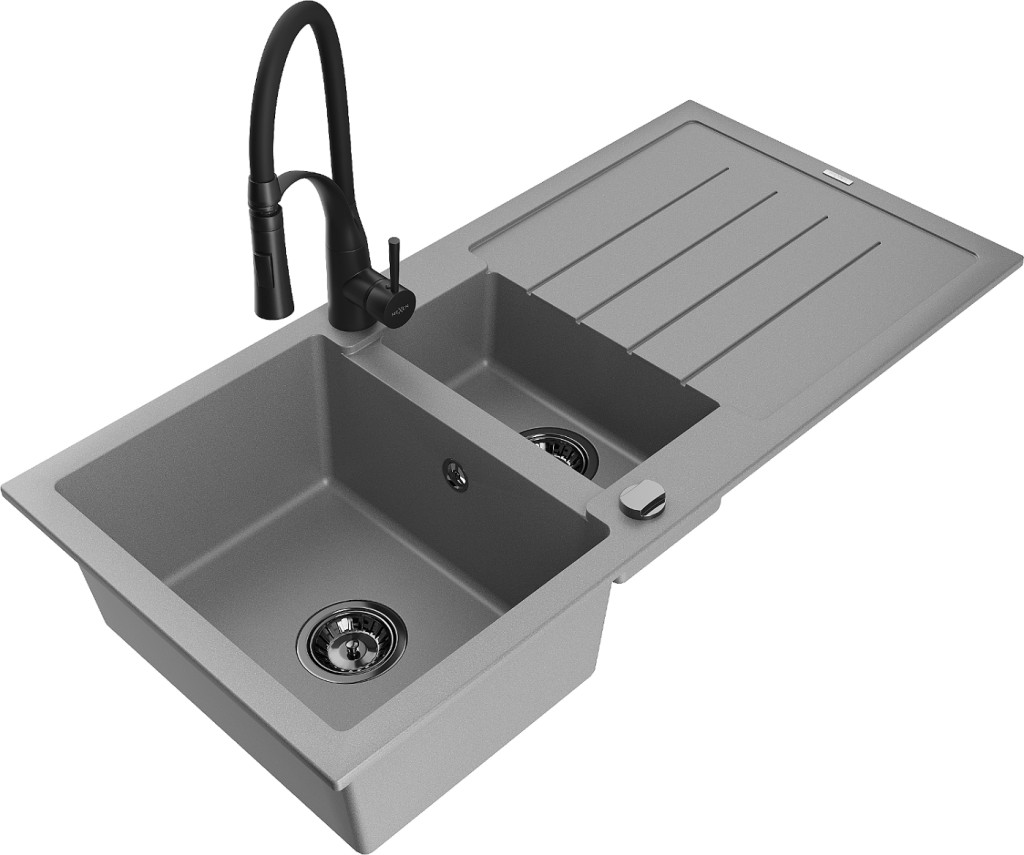 Technické dáta: Drez: Rozmer: 1000x500x200 mm Hĺbka komory: 190 mm (väčšia), 115 mm (menšia) Rozmery komory: 430x330 mm (väčšie), 340x170 mm (menšie) Priemer odtoku: ø90 mm Typ: 1,5-miska s odkvapkávačom Typ: Zapustené do pracovnej dosky Šedá farba Povrchová úprava sifónu: čierna Materiál: žula (80% žulové kamenivo 20% živice) Prepadový otvor: Áno Otvory: (batérie, automat) 2 Inštalácia: Univerzálna, je možné inštalovať s odkvapkávačom na ľavú alebo pravú stranu Vysoká odolnosť proti poškriabaniu a zmene farby Odolnosť proti tepelným šokom Povrch pre ľahké čistenie Dva dodatočné vyfrézované otvory na samodierovanie ø35 Kuchynská batéria: Materiál: mosadz Čierna farba Hlava: Keramická Perlátor: Áno Typ výtoku: Flexibilný s mosadznou podperou Typ: Jednopákové Výška batérie: 430 mm Rozsah výtoku: 235 mm(GT) Ean: 5905315047724