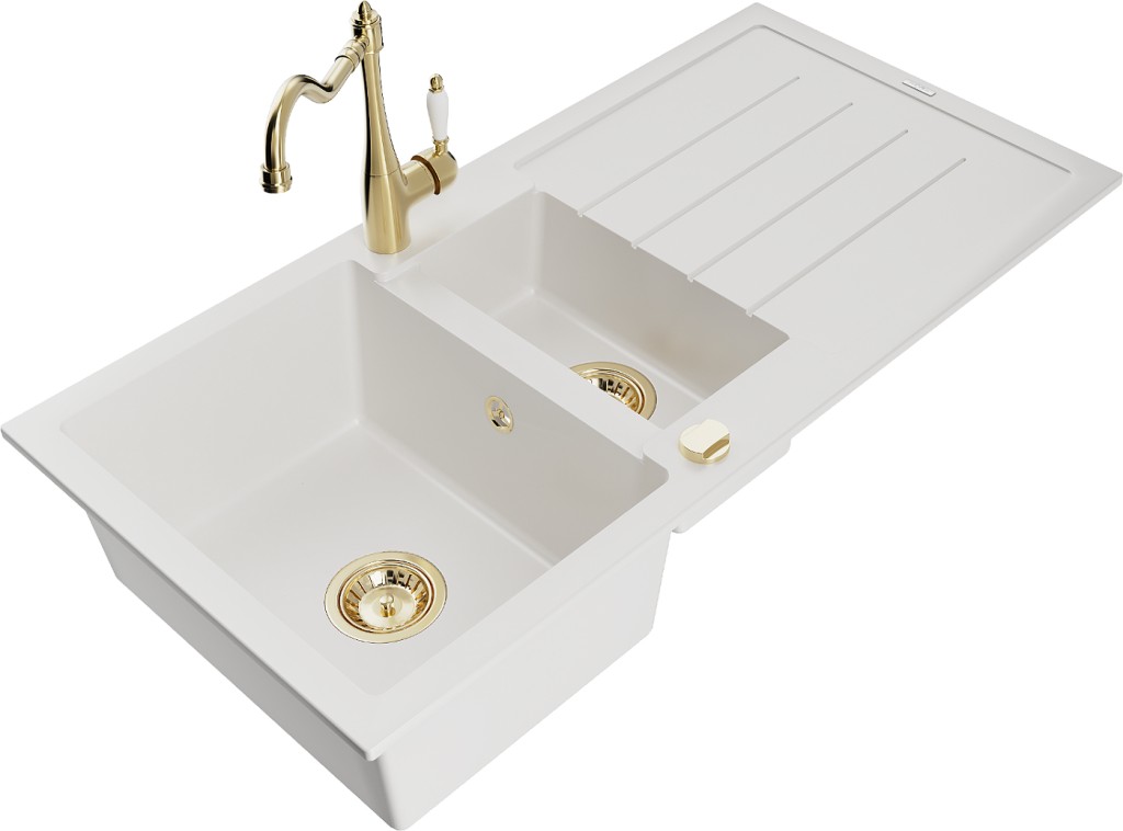Kuchynský drez: Rozmer: 1000x500x200 mm Hĺbka komory: 190 mm (väčšia), 115 mm (menšia) Rozmery komory: 430x330 mm (väčšie), 340x170 mm (menšie) Priemer odtoku: ø90 mm Typ: 1,5-miska s odkvapkávačom Typ: Zapustené do pracovnej dosky Farba: Biela Povrchová úprava sifónu: zlatá Materiál: žula (80% žulové kamenivo 20% živice) Prepadový otvor: Áno Otvory: (batérie, automat) 2 Inštalácia: Univerzálna, je možné inštalovať s odkvapkávačom na ľavú alebo pravú stranu Vysoká odolnosť proti poškriabaniu a zmene farby Odolnosť proti tepelným šokom Povrch pre ľahké čistenie Dva dodatočné vyfrézované otvory na samodierovanie ø35 Kuchynská batéria: Materiál: mosadz Farba: Zlatá Hlava: Keramická Perlátor: Áno Typ: Jednopáková Výška batérie: 290 mm Rozsah výtoku: 260 mm(GT) Ean: 5905315041241