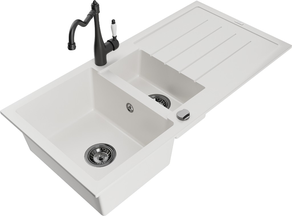 Kuchynský drez: Rozmer: 1000x500x200 mm Hĺbka komory: 190 mm (väčšia), 115 mm (menšia) Rozmery komory: 430x330 mm (väčšie), 340x170 mm (menšie) Priemer odtoku: ø90 mm Typ: 1,5-miska s odkvapkávačom Typ: Zapustené do pracovnej dosky Farba: Biela Povrchová úprava sifónu: čierna Materiál: žula (80% žulové kamenivo 20% živice) Prepadový otvor: Áno Otvory: (batérie, automat) 2 Inštalácia: Univerzálna, je možné inštalovať s odkvapkávačom na ľavú alebo pravú stranu Vysoká odolnosť proti poškriabaniu a zmene farby Odolnosť proti tepelným šokom Povrch pre ľahké čistenie Dva dodatočné vyfrézované otvory na samodierovanie ø35 Kuchynská batéria: Materiál: mosadz Farba: Čierna Hlava: Keramická Perlátor: Áno Typ: Jednopáková Výška batérie: 290 mm Rozsah výtoku: 260 mm(GT) Ean: 5905315041258