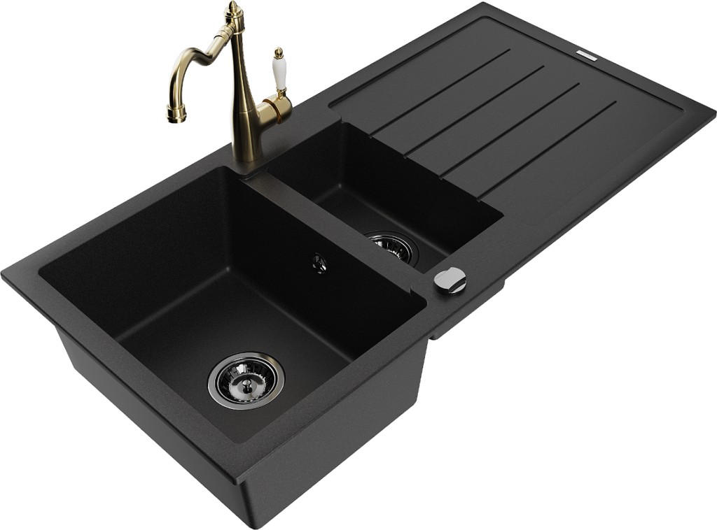 Drez: Rozmer: 1000x500x200 mm Hĺbka komory: 190 mm (väčšia), 115 mm (menšia) Rozmery komory: 430x330 mm (väčšie), 340x170 mm (menšie) Priemer odtoku: ø90 mm Typ: 1,5-miska s odkvapkávačom Typ: Zapustené do pracovnej dosky Čierna farba Povrchová úprava sifónu: čierna Materiál: žula (80% žulové kamenivo 20% živice) Prepadový otvor: Áno Otvory: (batérie, automat) 2 Inštalácia: Univerzálna, je možné inštalovať s odkvapkávačom na ľavú alebo pravú stranu Vysoká odolnosť proti poškriabaniu a zmene farby Odolnosť proti tepelným šokom Povrch pre ľahké čistenie Dva dodatočné vyfrézované otvory na samodierovanie ø35 Kuchynská batéria: Materiál: mosadz Farba: Zlatá Hlava: Keramická Perlátor: Áno Typ: Jednopáková Výška batérie: 290 mm Rozsah výtoku: 260 mm(GT) Ean: 5905315041517