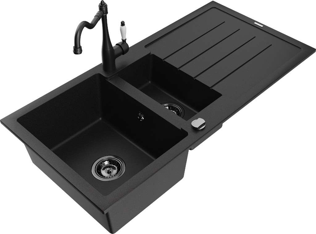 Drez: Rozmer: 1000x500x200 mm Hĺbka komory: 190 mm (väčšia), 115 mm (menšia) Rozmery komory: 430x330 mm (väčšie), 340x170 mm (menšie) Priemer odtoku: ø90 mm Typ: 1,5-miska s odkvapkávačom Typ: Zapustené do pracovnej dosky Čierna farba Povrchová úprava sifónu: čierna Materiál: žula (80% žulové kamenivo 20% živice) Prepadový otvor: Áno Otvory: (batérie, automat) 2 Inštalácia: Univerzálna, je možné inštalovať s odkvapkávačom na ľavú alebo pravú stranu Vysoká odolnosť proti poškriabaniu a zmene farby Odolnosť proti tepelným šokom Povrch pre ľahké čistenie Dva dodatočné vyfrézované otvory na samodierovanie ø35 Kuchynská batéria: Materiál: mosadz Čierna farba Hlava: Keramická Perlátor: Áno Typ: Jednopákové Výška batérie: 290 mm Rozsah výtoku: 260 mm(GT) Ean: 5905315041531