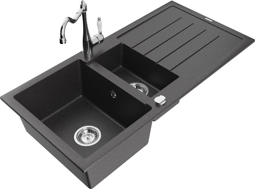 Drez: Rozmer: 1000x500x200 mm Hĺbka komory: 190 mm (väčšia), 115 mm (menšia) Rozmery komory: 430x330 mm (väčšie), 340x170 mm (menšie) Priemer odtoku: ø90 mm Typ: 1,5-miska s odkvapkávačom Typ: Zapustené do pracovnej dosky Farba: Škvrnitá čierna Povrchová úprava sifónu: Chrome Materiál: žula (80% žulové kamenivo 20% živice) Prepadový otvor: Áno Otvory: (batérie, automat) 2 Inštalácia: Univerzálna, je možné inštalovať s odkvapkávačom na ľavú alebo pravú stranu Vysoká odolnosť proti poškriabaniu a zmene farby Odolnosť proti tepelným šokom Povrch pre ľahké čistenie Dva dodatočné vyfrézované otvory na samodierovanie ø35 Kuchynská batéria: Materiál: mosadz Farba: Chrome Hlava: Keramická Perlátor: Áno Typ: Jednopákové Výška batérie: 290 mm Rozsah výtoku: 260 mm(GT) Ean: 5905315041449