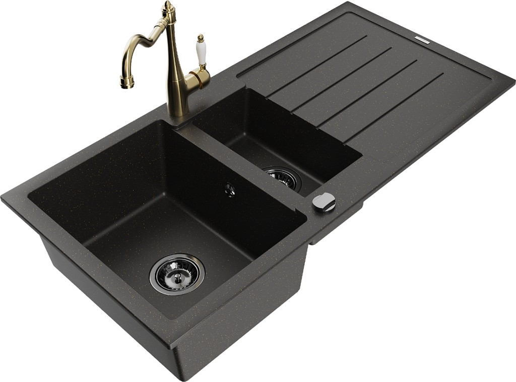 Drez: Rozmer: 1000x500x200 mm Hĺbka komory: 190 mm (väčšia), 115 mm (menšia) Rozmery komory: 430x330 mm (väčšie), 340x170 mm (menšie) Priemer odtoku: ø90 mm Typ: 1,5-miska s odkvapkávačom Typ: Zapustené do pracovnej dosky Farba: čierna / zlatá metalíza Povrchová úprava sifónu: čierna Materiál: žula (80% žulové kamenivo 20% živice) Prepadový otvor: Áno Otvory: (batérie, automat) 2 Inštalácia: Univerzálna, je možné inštalovať s odkvapkávačom na ľavú alebo pravú stranu Vysoká odolnosť proti poškriabaniu a zmene farby Odolnosť proti tepelným šokom Povrch pre ľahké čistenie Dva dodatočné vyfrézované otvory na samodierovanie ø35 Kuchynská batéria: Materiál: mosadz Farba: Zlatá Hlava: Keramická Perlátor: Áno Typ: Jednopákové Výška batérie: 290 mm Rozsah výtoku: 260 mm(GT) Ean: 5905315041418
