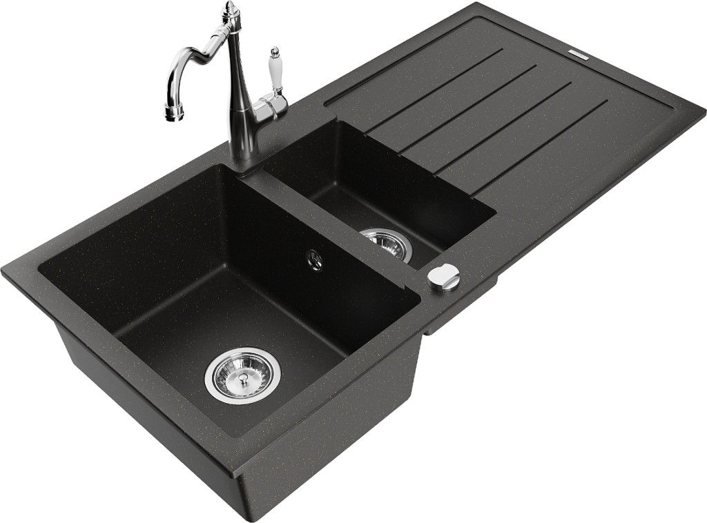 Drez: Rozmer: 1000x500x200 mm Hĺbka komory: 190 mm (väčšia), 115 mm (menšia) Rozmery komory: 430x330 mm (väčšie), 340x170 mm (menšie) Priemer odtoku: ø90 mm Typ: 1,5-miska s odkvapkávačom Typ: Zapustené do pracovnej dosky Farba: čierna / zlatá metalíza Povrchová úprava sifónu: Chrome Materiál: žula (80% žulové kamenivo 20% živice) Prepadový otvor: Áno Otvory: (batérie, automat) 2 Inštalácia: Univerzálna, je možné inštalovať s odkvapkávačom na ľavú alebo pravú stranu Vysoká odolnosť proti poškriabaniu a zmene farby Odolnosť proti tepelným šokom Povrch pre ľahké čistenie Dva dodatočné vyfrézované otvory na samodierovanie ø35 Kuchynská batéria: Materiál: mosadz Farba: Chrome Hlava: Keramická Perlátor: Áno Typ: Jednopákové Výška batérie: 290 mm Rozsah výtoku: 260 mm(GT) Ean: 5905315041395