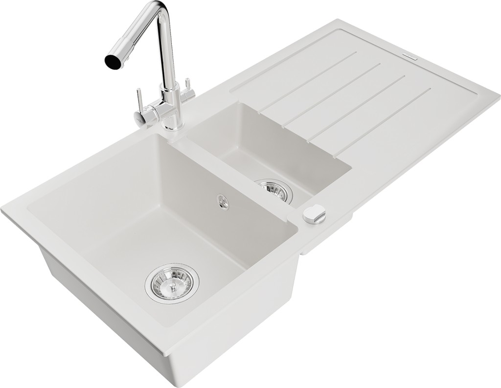 Technické údaje: Kuchynský drez: Rozmer: 1000x500x200 mm Hĺbka komory: 190 mm (väčšia), 115 mm (menšia) Rozmery komory: 430x330 mm (väčšie), 340x170 mm (menšie) Priemer odtoku: ø90 mm Typ: 1,5-miska s odkvapkávačom Typ: Zapustené do pracovnej dosky Farba: Biela Povrchová úprava sifónu: Chrome Materiál: žula (80% žulové kamenivo 20% živice) Prepadový otvor: Áno Otvory: (batérie, automat) 2 Inštalácia: Univerzálna, je možné inštalovať s odkvapkávačom na ľavú alebo pravú stranu Vysoká odolnosť proti poškriabaniu a zmene farby Odolnosť proti tepelným šokom Povrch pre ľahké čistenie Dva dodatočné vyfrézované otvory na samodierovanie ø35 Kuchynská batéria: Materiál: mosadz Farba: Chrome Hlava: Keramická Perlátor: Áno Typ: Dve rukoväte Rozsah výtoku: 235 mm Výška batérie: 315 mm Dvojhlavá batéria s prídavným filtrom na pitnú vodu(GT) Ean: 5905315025852
