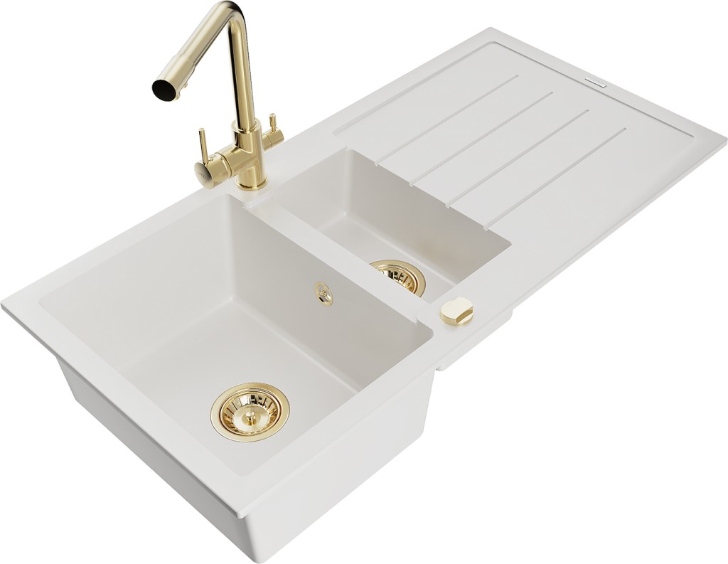 Technické údaje: Kuchynský drez: Rozmer: 1000x500x200 mm Hĺbka komory: 190 mm (väčšia), 115 mm (menšia) Rozmery komory: 430x330 mm (väčšie), 340x170 mm (menšie) Priemer odtoku: ø90 mm Typ: 1,5-miska s odkvapkávačom Typ: Zapustené do pracovnej dosky Farba: Biela Povrchová úprava sifónu: zlatá Materiál: žula (80% žulové kamenivo 20% živice) Prepadový otvor: Áno Otvory: (batérie, automat) 2 Inštalácia: Univerzálna, je možné inštalovať s odkvapkávačom na ľavú alebo pravú stranu Vysoká odolnosť proti poškriabaniu a zmene farby Odolnosť proti tepelným šokom Povrch pre ľahké čistenie Dva dodatočné vyfrézované otvory na samodierovanie ø35 Kuchynská batéria: Materiál: mosadz Farba: Zlatá Hlava: Keramická Perlátor: Áno Typ: Dve rukoväte Rozsah výtoku: 235 mm Výška batérie: 315 mm Dvojhlavá batéria s prídavným filtrom na pitnú vodu(GT) Ean: 5905315025876