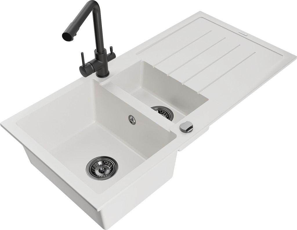 Technické údaje: Kuchynský drez: Rozmer: 1000x500x200 mm Hĺbka komory: 190 mm (väčšia), 115 mm (menšia) Rozmery komory: 430x330 mm (väčšie), 340x170 mm (menšie) Priemer odtoku: ø90 mm Typ: 1,5-miska s odkvapkávačom Typ: Zapustené do pracovnej dosky Farba: Biela Povrchová úprava sifónu: čierna Materiál: žula (80% žulové kamenivo 20% živice) Prepadový otvor: Áno Otvory: (batérie, automat) 2 Inštalácia: Univerzálna, je možné inštalovať s odkvapkávačom na ľavú alebo pravú stranu Vysoká odolnosť proti poškriabaniu a zmene farby Odolnosť proti tepelným šokom Povrch pre ľahké čistenie Dva dodatočné vyfrézované otvory na samodierovanie ø35 Kuchynská batéria: Materiál: mosadz Farba: Čierna Hlava: Keramická Perlátor: Áno Typ: Dve rukoväte Rozsah výtoku: 235 mm Výška batérie: 315 mm Dvojhlavá batéria s prídavným filtrom na pitnú vodu(GT) Ean: 5905315025883