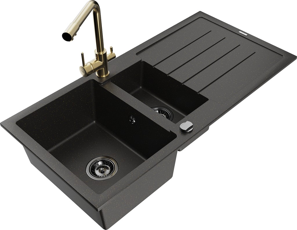 Technické dáta: Drez: Rozmer: 1000x500x200 mm Hĺbka komory: 190 mm (väčšia), 115 mm (menšia) Rozmery komory: 430x330 mm (väčšie), 340x170 mm (menšie) Priemer odtoku: ø90 mm Typ: 1,5-miska s odkvapkávačom Typ: Zapustené do pracovnej dosky Farba: čierna / zlatá metalíza Povrchová úprava sifónu: čierna Materiál: žula (80% žulové kamenivo 20% živice) Prepadový otvor: Áno Otvory: (batérie, automat) 2 Inštalácia: Univerzálna, je možné inštalovať s odkvapkávačom na ľavú alebo pravú stranu Vysoká odolnosť proti poškriabaniu a zmene farby Odolnosť proti tepelným šokom Povrch pre ľahké čistenie Dva dodatočné vyfrézované otvory na samodierovanie ø35 Kuchynská batéria: Materiál: mosadz Farba: Zlatá Hlava: Keramická Perlátor: Áno Typ: Dve rukoväte Rozsah výtoku: 235 mm Výška batérie: 315 mm Dvojhlavá batéria s prídavným filtrom na pitnú vodu(GT) Ean: 5905315026040