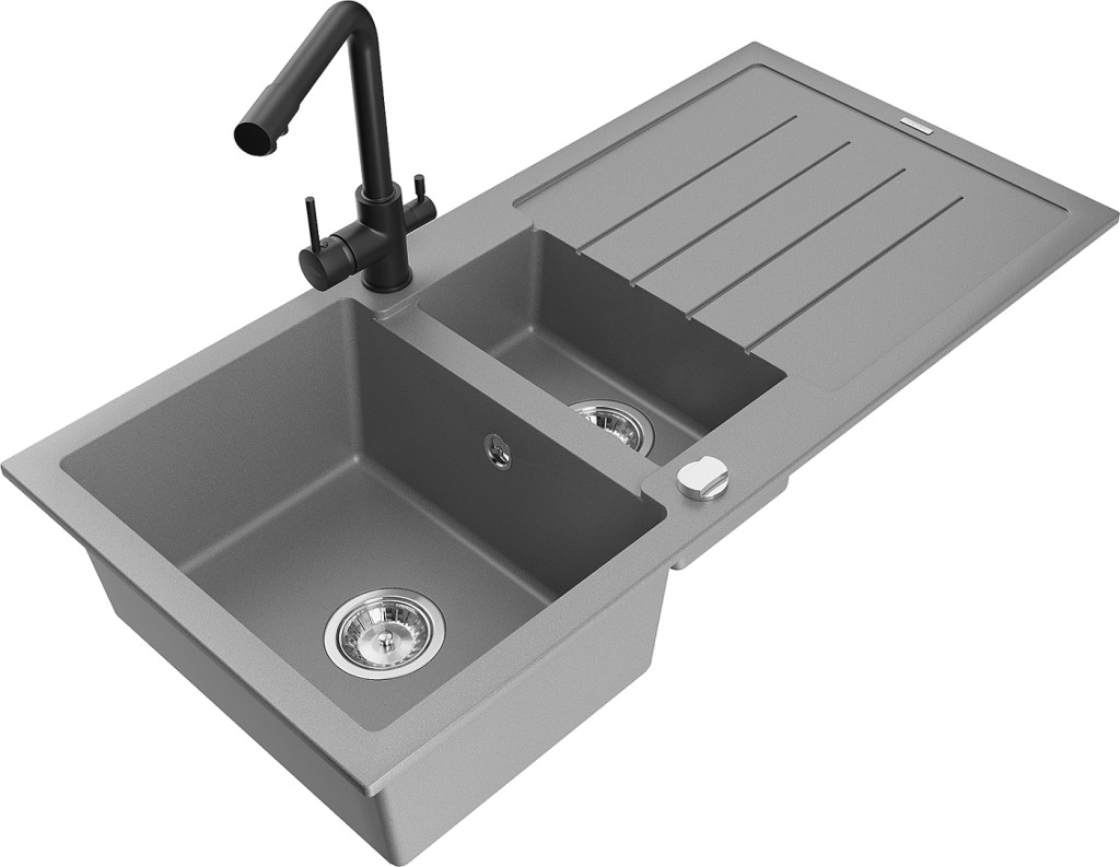 Technické dáta: Drez: Rozmer: 1000x500x200 mm Hĺbka komory: 190 mm (väčšia), 115 mm (menšia) Rozmery komory: 430x330 mm (väčšie), 340x170 mm (menšie) Priemer odtoku: ø90 mm Typ: 1,5-miska s odkvapkávačom Typ: Zapustené do pracovnej dosky Šedá farba Povrchová úprava sifónu: Chrome Materiál: žula (80% žulové kamenivo 20% živice) Prepadový otvor: Áno Otvory: (batérie, automat) 2 Inštalácia: Univerzálna, je možné inštalovať s odkvapkávačom na ľavú alebo pravú stranu Vysoká odolnosť proti poškriabaniu a zmene farby Odolnosť proti tepelným šokom Povrch pre ľahké čistenie Dva dodatočné vyfrézované otvory na samodierovanie ø35 Kuchynská batéria: Materiál: mosadz Čierna farba Hlava: Keramická Perlátor: Áno Typ: Dve rukoväte Rozsah výtoku: 235 mm Výška batérie: 315 mm Dvojhlavá batéria s prídavným filtrom na pitnú vodu(GT) Ean: 5905315025951
