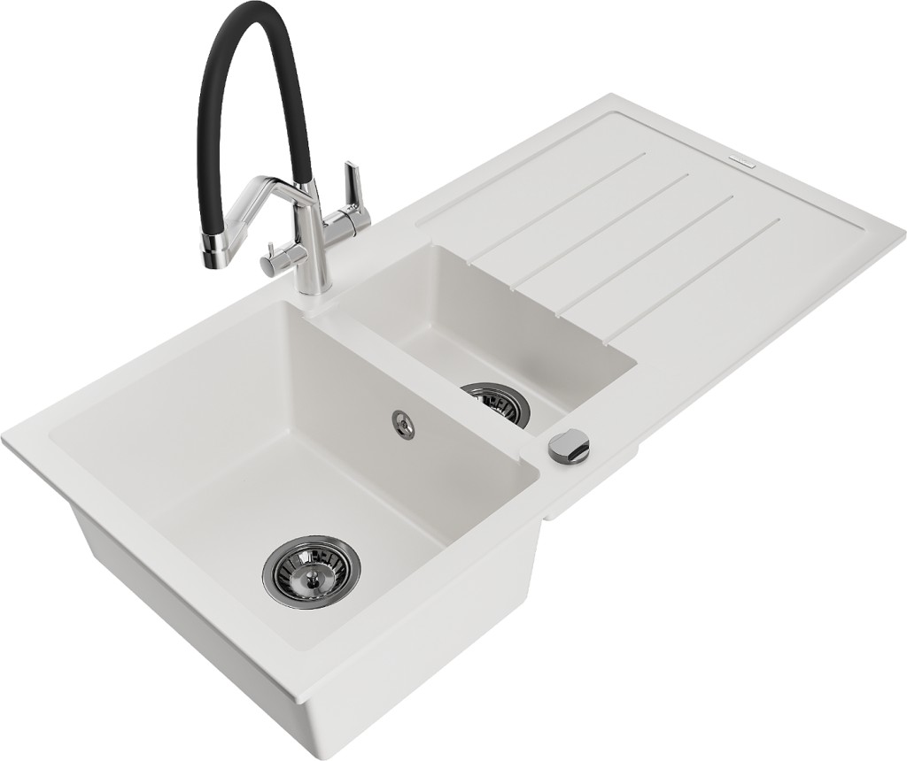 Technické údaje: Kuchynský drez: Rozmer: 1000x500x200 mm Hĺbka komory: 190 mm (väčšia), 115 mm (menšia) Rozmery komory: 430x330 mm (väčšie), 340x170 mm (menšie) Priemer odtoku: ø90 mm Typ: 1,5-miska s odkvapkávačom Typ: Zapustené do pracovnej dosky Farba: Biela Povrchová úprava sifónu: čierna Materiál: žula (80% žulové kamenivo 20% živice) Prepadový otvor: Áno Otvory: (batérie, automat) 2 Inštalácia: Univerzálna, je možné inštalovať s odkvapkávačom na ľavú alebo pravú stranu Vysoká odolnosť proti poškriabaniu a zmene farby Odolnosť proti tepelným šokom Povrch pre ľahké čistenie Dva dodatočné vyfrézované otvory na samodierovanie ø35 Kuchynská batéria: Materiál: mosadz Farba: chróm/čierna Hlavy: Keramické Perlátor: Áno Typ výtoku: Flexibilný s mosadzným držiakom Rozsah výtoku: 260 mm Výška: 405 mm Typ: Dve rukoväte Dvojhlavá batéria s prídavným filtrom na pitnú vodu(GT) Ean: 5905315102621