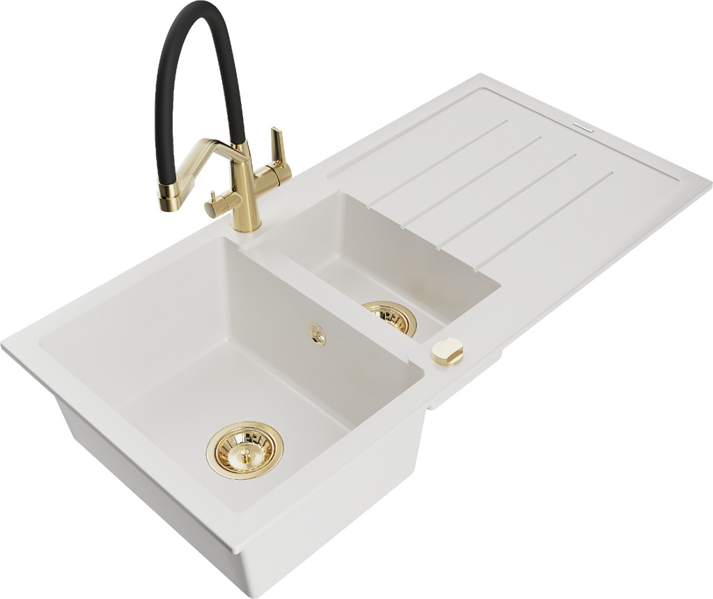 Technické údaje: Kuchynský drez: Rozmer: 1000x500x200 mm Hĺbka komory: 190 mm (väčšia), 115 mm (menšia) Rozmery komory: 430x330 mm (väčšie), 340x170 mm (menšie) Priemer odtoku: ø90 mm Typ: 1,5-miska s odkvapkávačom Typ: Zapustené do pracovnej dosky Farba: Biela Povrchová úprava sifónu: zlatá Materiál: žula (80% žulové kamenivo 20% živice) Prepadový otvor: Áno Otvory: (batérie, automat) 2 Inštalácia: Univerzálna, je možné inštalovať s odkvapkávačom na ľavú alebo pravú stranu Vysoká odolnosť proti poškriabaniu a zmene farby Odolnosť proti tepelným šokom Povrch pre ľahké čistenie Dva dodatočné vyfrézované otvory na samodierovanie ø35 Kuchynská batéria: Materiál: mosadz Farba: Zlatá/Čierna Hlavy: Keramické Perlátor: Áno Typ výtoku: Flexibilný s mosadzným držiakom Rozsah výtoku: 260 mm Výška: 405 mm Typ: Dve rukoväte Dvojhlavá batéria s prídavným filtrom na pitnú vodu(GT) Ean: 5905315102638