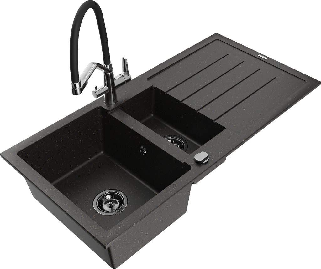 Technické dáta: Drez: Rozmer: 1000x500x200 mm Hĺbka komory: 190 mm (väčšia), 115 mm (menšia) Rozmery komory: 430x330 mm (väčšie), 340x170 mm (menšie) Priemer odtoku: ø90 mm Typ: 1,5-miska s odkvapkávačom Typ: Zapustené do pracovnej dosky Farba: čierna / zlatá metalíza Povrchová úprava sifónu: čierna Materiál: žula (80% žulové kamenivo 20% živice) Prepadový otvor: Áno Otvory: (batérie, automat) 2 Inštalácia: Univerzálna, je možné inštalovať s odkvapkávačom na ľavú alebo pravú stranu Vysoká odolnosť proti poškriabaniu a zmene farby Odolnosť proti tepelným šokom Povrch pre ľahké čistenie Dva dodatočné vyfrézované otvory na samodierovanie ø35 Kuchynská batéria: Materiál: mosadz Farba: chróm/čierna Hlavy: Keramické Perlátor: Áno Typ výtoku: Flexibilný s mosadznou podperou Rozsah výtoku: 260 mm Výška: 405 mm Typ: Dve rukoväte Dvojhlavá batéria s prídavným filtrom na pitnú vodu(GT) Ean: 5905315102829