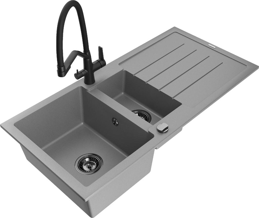 Technické dáta: Drez: Rozmer: 1000x500x200 mm Hĺbka komory: 190 mm (väčšia), 115 mm (menšia) Rozmery komory: 430x330 mm (väčšie), 340x170 mm (menšie) Priemer odtoku: ø90 mm Typ: 1,5-miska s odkvapkávačom Typ: Zapustené do pracovnej dosky Šedá farba Povrchová úprava sifónu: čierna Materiál: žula (80% žulové kamenivo 20% živice) Prepadový otvor: Áno Otvory: (batérie, automat) 2 Inštalácia: Univerzálna, je možné inštalovať s odkvapkávačom na ľavú alebo pravú stranu Vysoká odolnosť proti poškriabaniu a zmene farby Odolnosť proti tepelným šokom Povrch pre ľahké čistenie Dva dodatočné vyfrézované otvory na samodierovanie ø35 Kuchynská batéria: Materiál: mosadz Čierna farba Hlavy: Keramické Perlátor: Áno Typ výtoku: Flexibilný s mosadznou podperou Rozsah výtoku: 260 mm Výška: 405 mm Typ: Dve rukoväte Dvojhlavá batéria s prídavným filtrom na pitnú vodu(GT) Ean: 5905315102751