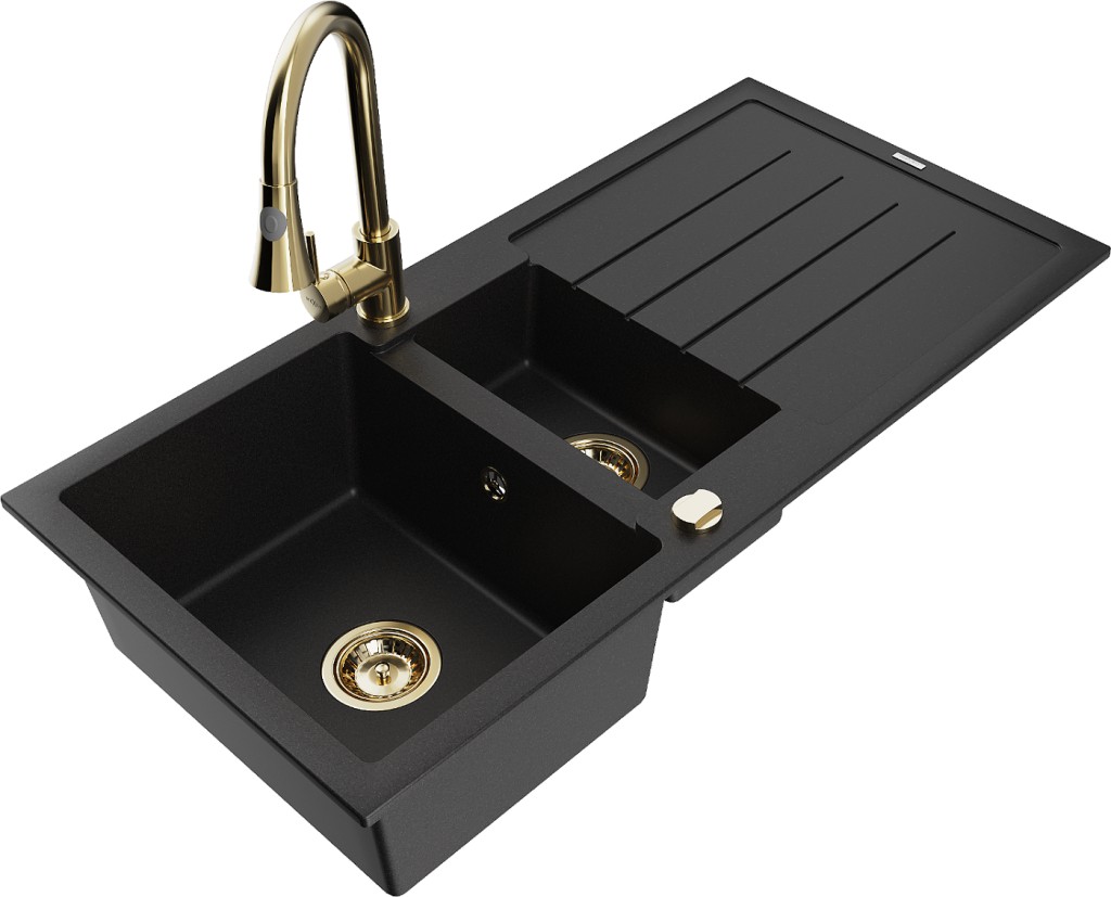 Technické dáta: Drez: Rozmer: 1000x500x200 mm Hĺbka komory: 190 mm (väčšia), 115 mm (menšia) Rozmery komory: 430x330 mm (väčšie), 340x170 mm (menšie) Priemer odtoku: ø90 mm Typ: 1,5-miska s odkvapkávačom Typ: Zapustené do pracovnej dosky Čierna farba Povrchová úprava sifónu: zlatá Materiál: žula (80% žulové kamenivo 20% živice) Prepadový otvor: Áno Otvory: (batérie, automat) 2 Inštalácia: Univerzálna, je možné inštalovať s odkvapkávačom na ľavú alebo pravú stranu Vysoká odolnosť proti poškriabaniu a zmene farby Odolnosť proti tepelným šokom Povrch pre ľahké čistenie Dva dodatočné vyfrézované otvory na samodierovanie ø35 Kuchynská batéria: Materiál: mosadz Farba: Zlatá Hlava: Keramická Perlátor: Áno Typ: Jednopákové Výška batérie: 380 mm Rozsah výtoku: 252 mm Typ výtoku: Výsuvný(GT) Ean: 5905315031259