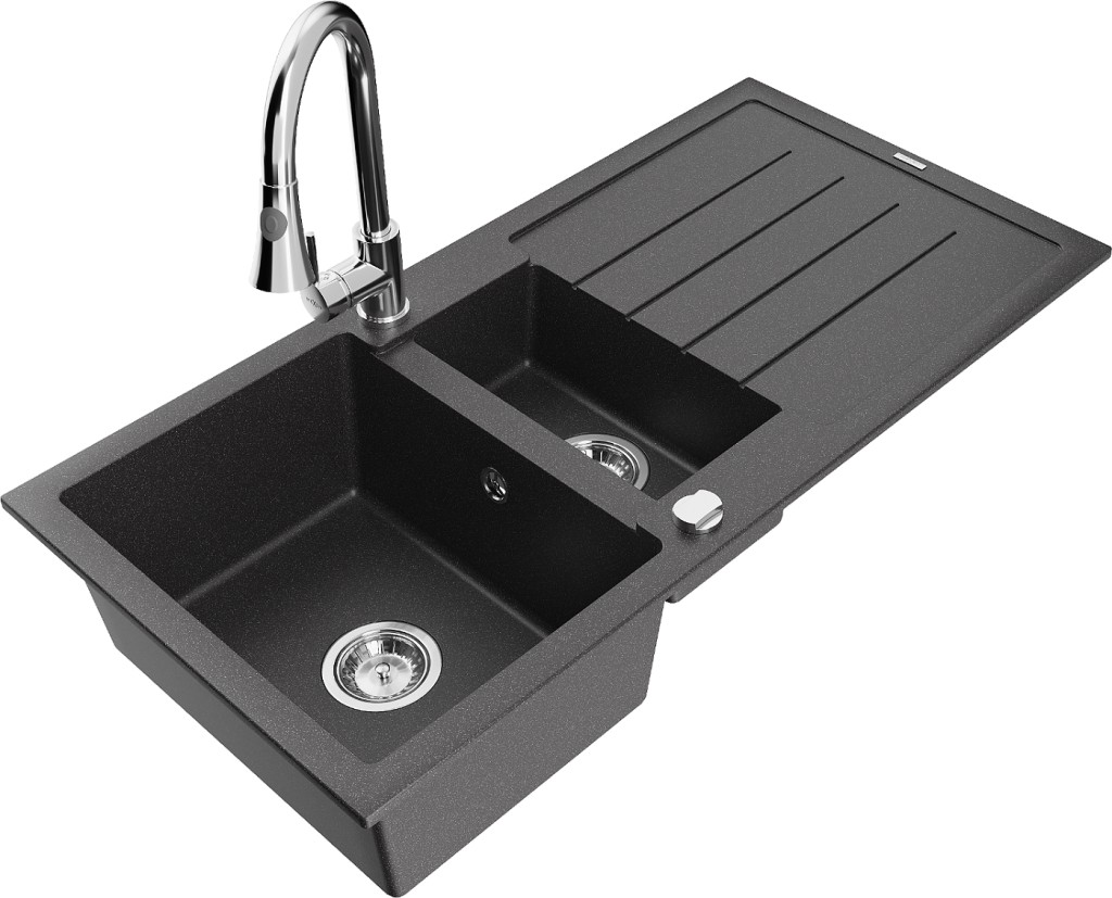 Technické dáta: Drez: Rozmer: 1000x500x200 mm Hĺbka komory: 190 mm (väčšia), 115 mm (menšia) Rozmery komory: 430x330 mm (väčšie), 340x170 mm (menšie) Priemer odtoku: ø90 mm Typ: 1,5-miska s odkvapkávačom Typ: Zapustené do pracovnej dosky Farba: Škvrnitá čierna Povrchová úprava sifónu: Chrome Materiál: žula (80% žulové kamenivo 20% živice) Prepadový otvor: Áno Otvory: (batérie, automat) 2 Inštalácia: Univerzálna, je možné inštalovať s odkvapkávačom na ľavú alebo pravú stranu Vysoká odolnosť proti poškriabaniu a zmene farby Odolnosť proti tepelným šokom Povrch pre ľahké čistenie Dva dodatočné vyfrézované otvory na samodierovanie ø35 Kuchynská batéria: Materiál: mosadz Farba: Chrome Hlava: Keramická Perlátor: Áno Typ: Jednopákové Výška batérie: 380 mm Rozsah výtoku: 252 mm Typ výtoku: Výsuvný(GT) Ean: 5905315031198