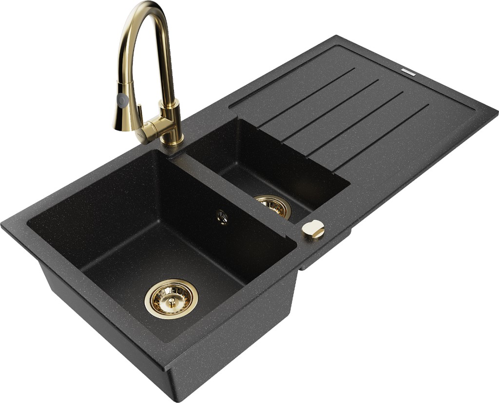 Technické dáta: Drez: Rozmer: 1000x500x200 mm Hĺbka komory: 190 mm (väčšia), 115 mm (menšia) Rozmery komory: 430x330 mm (väčšie), 340x170 mm (menšie) Priemer odtoku: ø90 mm Typ: 1,5-miska s odkvapkávačom Typ: Zapustené do pracovnej dosky Farba: čierna/strieborná metalíza Povrchová úprava sifónu: zlatá Materiál: žula (80% žulové kamenivo 20% živice) Prepadový otvor: Áno Otvory: (batérie, automat) 2 Inštalácia: Univerzálna, je možné inštalovať s odkvapkávačom na ľavú alebo pravú stranu Vysoká odolnosť proti poškriabaniu a zmene farby Odolnosť proti tepelným šokom Povrch pre ľahké čistenie Dva dodatočné vyfrézované otvory na samodierovanie ø35 Kuchynská batéria: Materiál: mosadz Farba: Zlatá Hlava: Keramická Perlátor: Áno Typ: Jednopákové Výška batérie: 380 mm Rozsah výtoku: 252 mm Typ výtoku: Výsuvný(GT) Ean: 5905315031112