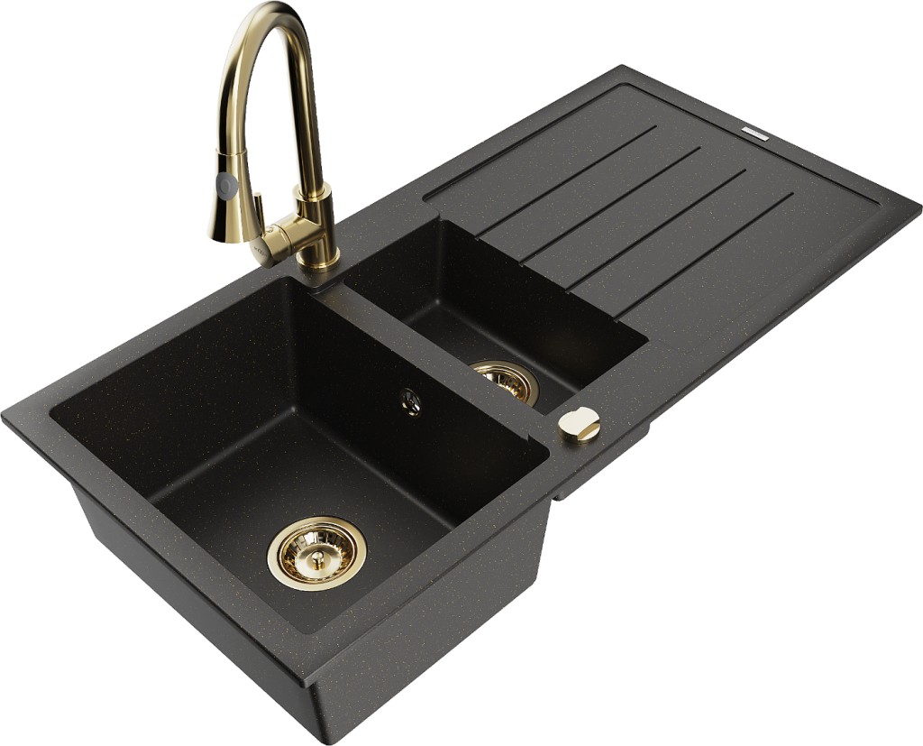 Technické dáta: Drez: Rozmer: 1000x500x200 mm Hĺbka komory: 190 mm (väčšia), 115 mm (menšia) Rozmery komory: 430x330 mm (väčšie), 340x170 mm (menšie) Priemer odtoku: ø90 mm Typ: 1,5-miska s odkvapkávačom Typ: Zapustené do pracovnej dosky Farba: čierna / zlatá metalíza Povrchová úprava sifónu: zlatá Materiál: žula (80% žulové kamenivo 20% živice) Prepadový otvor: Áno Otvory: (batérie, automat) 2 Inštalácia: Univerzálna, je možné inštalovať s odkvapkávačom na ľavú alebo pravú stranu Vysoká odolnosť proti poškriabaniu a zmene farby Odolnosť proti tepelným šokom Povrch pre ľahké čistenie Dva dodatočné vyfrézované otvory na samodierovanie ø35 Kuchynská batéria: Materiál: mosadz Farba: Zlatá Hlava: Keramická Perlátor: Áno Typ: Jednopáková Výška batérie: 380 mm Rozsah výtoku: 252 mm Typ výtoku: Výsuvný(GT) Ean: 5905315031150