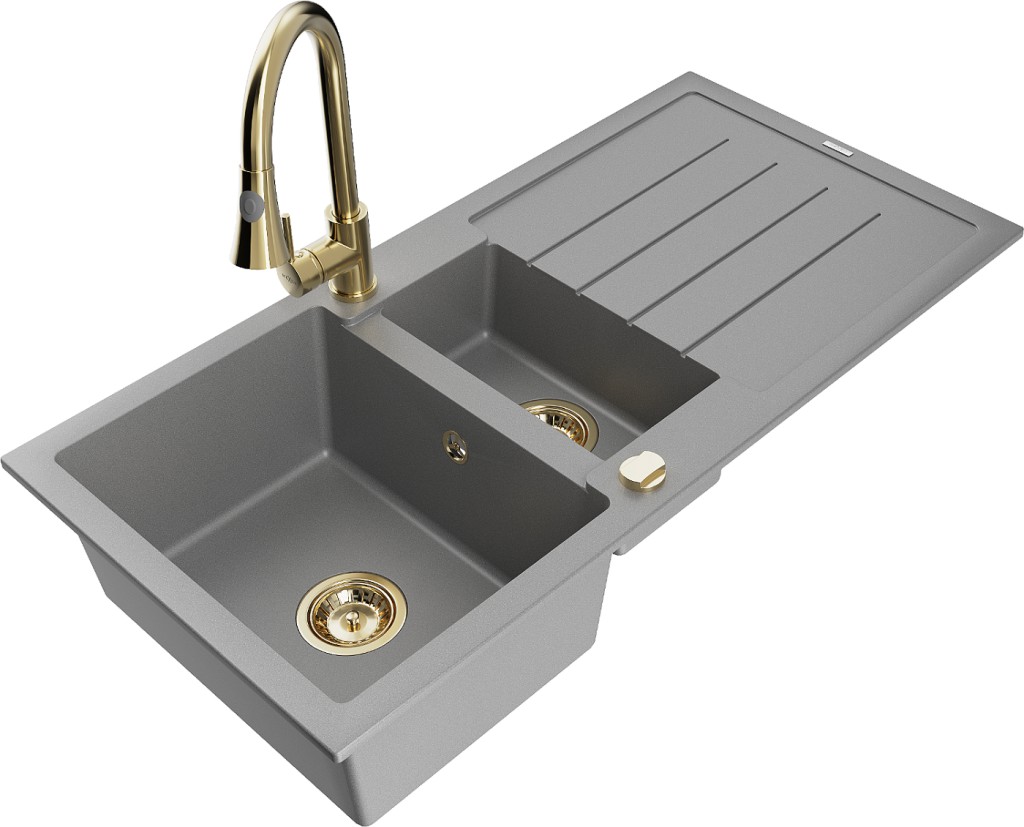 Technické dáta: Drez: Rozmer: 1000x500x200 mm Hĺbka komory: 190 mm (väčšia), 115 mm (menšia) Rozmery komory: 430x330 mm (väčšie), 340x170 mm (menšie) Priemer odtoku: ø90 mm Typ: 1,5-miska s odkvapkávačom Typ: Zapustené do pracovnej dosky Šedá farba Povrchová úprava sifónu: zlatá Materiál: žula (80% žulové kamenivo 20% živice) Prepadový otvor: Áno Otvory: (batérie, automat) 2 Inštalácia: Univerzálna, je možné inštalovať s odkvapkávačom na ľavú alebo pravú stranu Vysoká odolnosť proti poškriabaniu a zmene farby Odolnosť proti tepelným šokom Povrch pre ľahké čistenie Dva dodatočné vyfrézované otvory na samodierovanie ø35 Kuchynská batéria: Materiál: mosadz Farba: Zlatá Hlava: Keramická Perlátor: Áno Typ: Jednopáková Výška batérie: 380 mm Rozsah výtoku: 252 mm Typ výtoku: Výsuvný(GT) Ean: 5905315031068