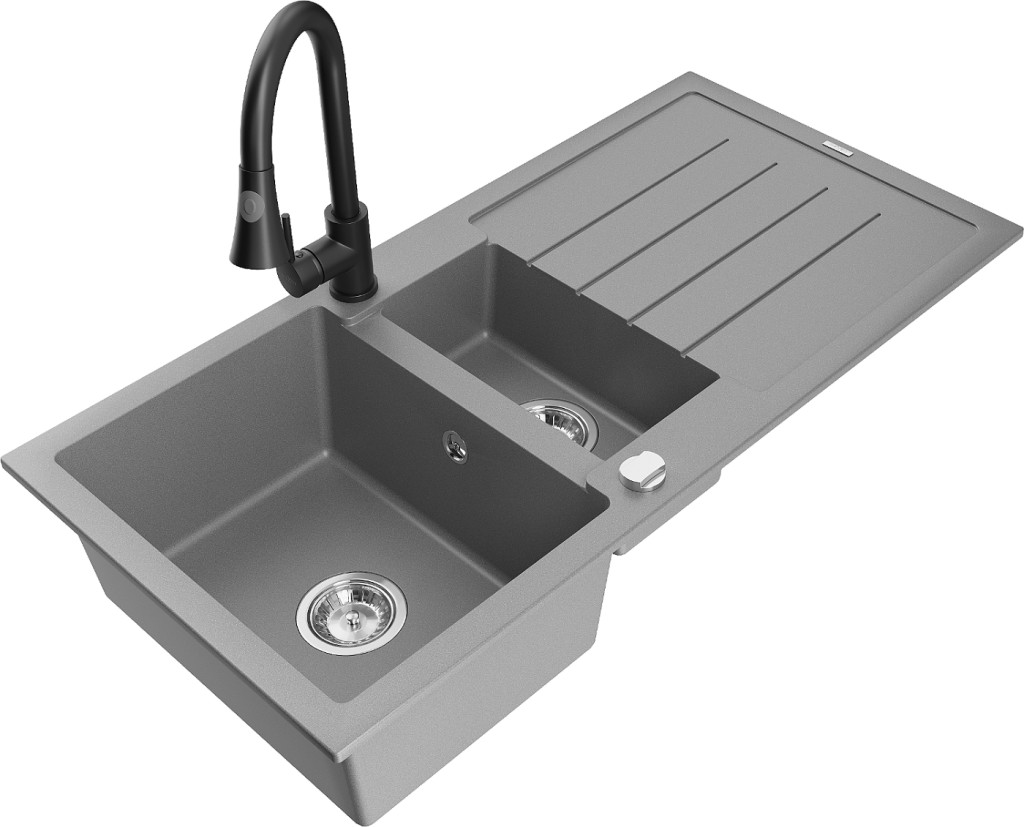 Technické dáta: Drez: Rozmer: 1000x500x200 mm Hĺbka komory: 190 mm (väčšia), 115 mm (menšia) Rozmery komory: 430x330 mm (väčšie), 340x170 mm (menšie) Priemer odtoku: ø90 mm Typ: 1,5-miska s odkvapkávačom Typ: Zapustené do pracovnej dosky Šedá farba Povrchová úprava sifónu: Chrome Materiál: žula (80% žulové kamenivo 20% živice) Prepadový otvor: Áno Otvory: (batérie, automat) 2 Inštalácia: Univerzálna, je možné inštalovať s odkvapkávačom na ľavú alebo pravú stranu Vysoká odolnosť proti poškriabaniu a zmene farby Odolnosť proti tepelným šokom Povrch pre ľahké čistenie Dva dodatočné vyfrézované otvory na samodierovanie ø35 Kuchynská batéria: Materiál: mosadz Čierna farba Hlava: Keramická Perlátor: Áno Typ: Jednopákové Výška batérie: 380 mm Rozsah výtoku: 252 mm Typ výtoku: Výsuvný(GT) Ean: 5905315031075