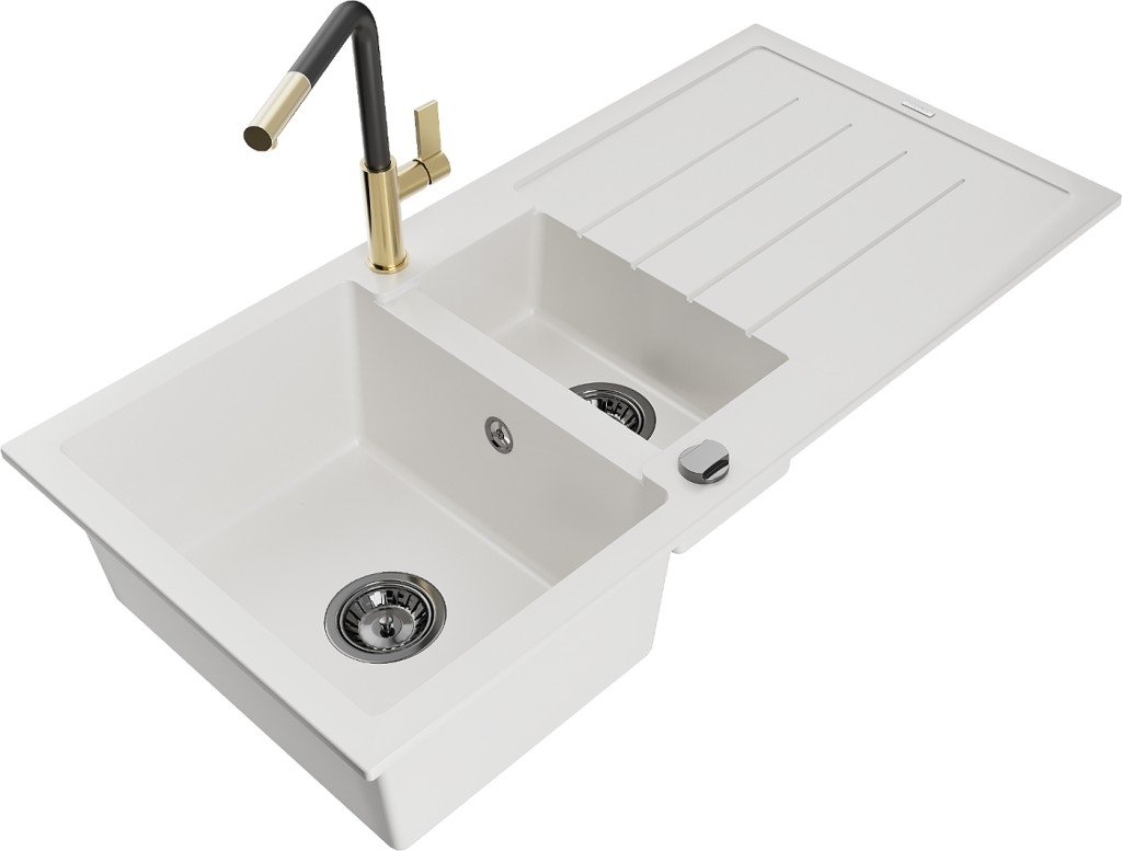 Technické údaje: Kuchynský drez: Rozmer: 1000x500x200 mm Hĺbka komory: 190 mm (väčšia), 115 mm (menšia) Rozmery komory: 430x330 mm (väčšie), 340x170 mm (menšie) Priemer odtoku: ø90 mm Typ: 1,5-miska s odkvapkávačom Typ: Zapustené do pracovnej dosky Farba: Biela Povrchová úprava sifónu: čierna Materiál: žula (80% žulové kamenivo 20% živice) Prepadový otvor: Áno Otvory: (batérie, automat) 2 Inštalácia: Univerzálna, je možné inštalovať s odkvapkávačom na ľavú alebo pravú stranu Vysoká odolnosť proti poškriabaniu a zmene farby Odolnosť proti tepelným šokom Povrch pre ľahké čistenie Dva dodatočné vyfrézované otvory na samodierovanie ø35 Kuchynská batéria: Materiál: mosadz Farba: Zlatá/Čierna Hlava: Keramická Perlátor: Áno Typ: Jednopákové Rozsah výtoku: 245 mm Výška batérie: 307 mm(GT) Ean: 5905315062017