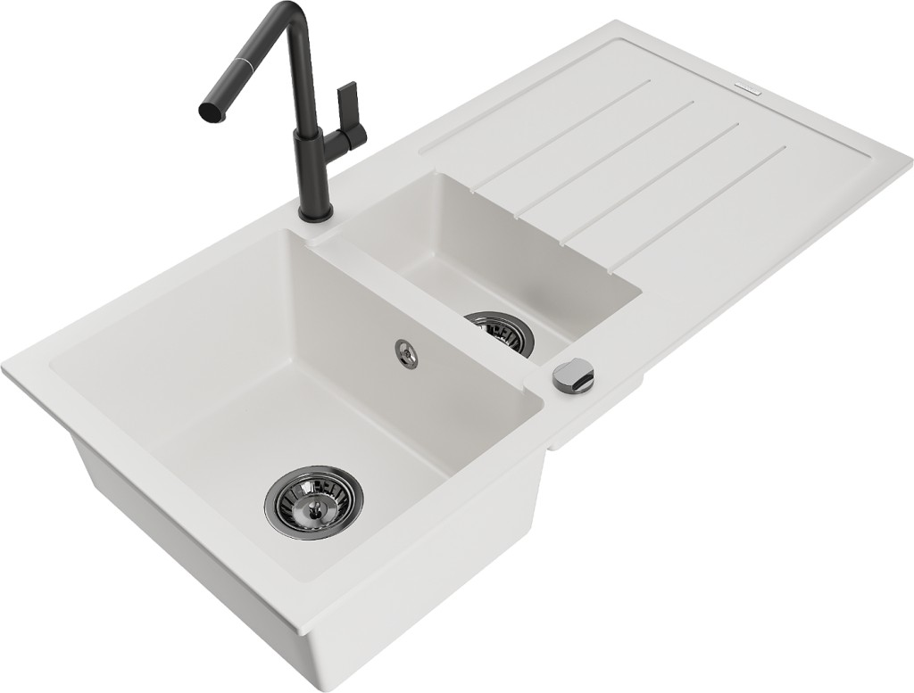 Technické údaje: Kuchynský drez: Rozmer: 1000x500x200 mm Hĺbka komory: 190 mm (väčšia), 115 mm (menšia) Rozmery komory: 430x330 mm (väčšie), 340x170 mm (menšie) Priemer odtoku: ø90 mm Typ: 1,5-miska s odkvapkávačom Typ: Zapustené do pracovnej dosky Farba: Biela Povrchová úprava sifónu: čierna Materiál: žula (80% žulové kamenivo 20% živice) Prepadový otvor: Áno Otvory: (batérie, automat) 2 Inštalácia: Univerzálna, je možné inštalovať s odkvapkávačom na ľavú alebo pravú stranu Vysoká odolnosť proti poškriabaniu a zmene farby Odolnosť proti tepelným šokom Povrch pre ľahké čistenie Dva dodatočné vyfrézované otvory na samodierovanie ø35 Kuchynská batéria: Materiál: mosadz Farba: Čierna Hlava: Keramická Perlátor: Áno Typ: Jednopákové Rozsah výtoku: 245 mm Výška batérie: 307 mm(GT) Ean: 5905315062024