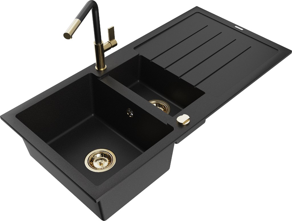 Technické dáta: Drez: Rozmer: 1000x500x200 mm Hĺbka komory: 190 mm (väčšia), 115 mm (menšia) Rozmery komory: 430x330 mm (väčšie), 340x170 mm (menšie) Priemer odtoku: ø90 mm Typ: 1,5-miska s odkvapkávačom Typ: Zapustené do pracovnej dosky Čierna farba Povrchová úprava sifónu: zlatá Materiál: žula (80% žulové kamenivo 20% živice) Prepadový otvor: Áno Otvory: (batérie, automat) 2 Inštalácia: Univerzálna, je možné inštalovať s odkvapkávačom na ľavú alebo pravú stranu Vysoká odolnosť proti poškriabaniu a zmene farby Odolnosť proti tepelným šokom Povrch pre ľahké čistenie Dva dodatočné vyfrézované otvory na samodierovanie ø35 Kuchynská batéria: Materiál: mosadz Farba: Zlatá/Čierna Hlava: Keramická Perlátor: Áno Typ: Jednopákové Rozsah výtoku: 245 mm Výška batérie: 307 mm(GT) Ean: 5905315062420