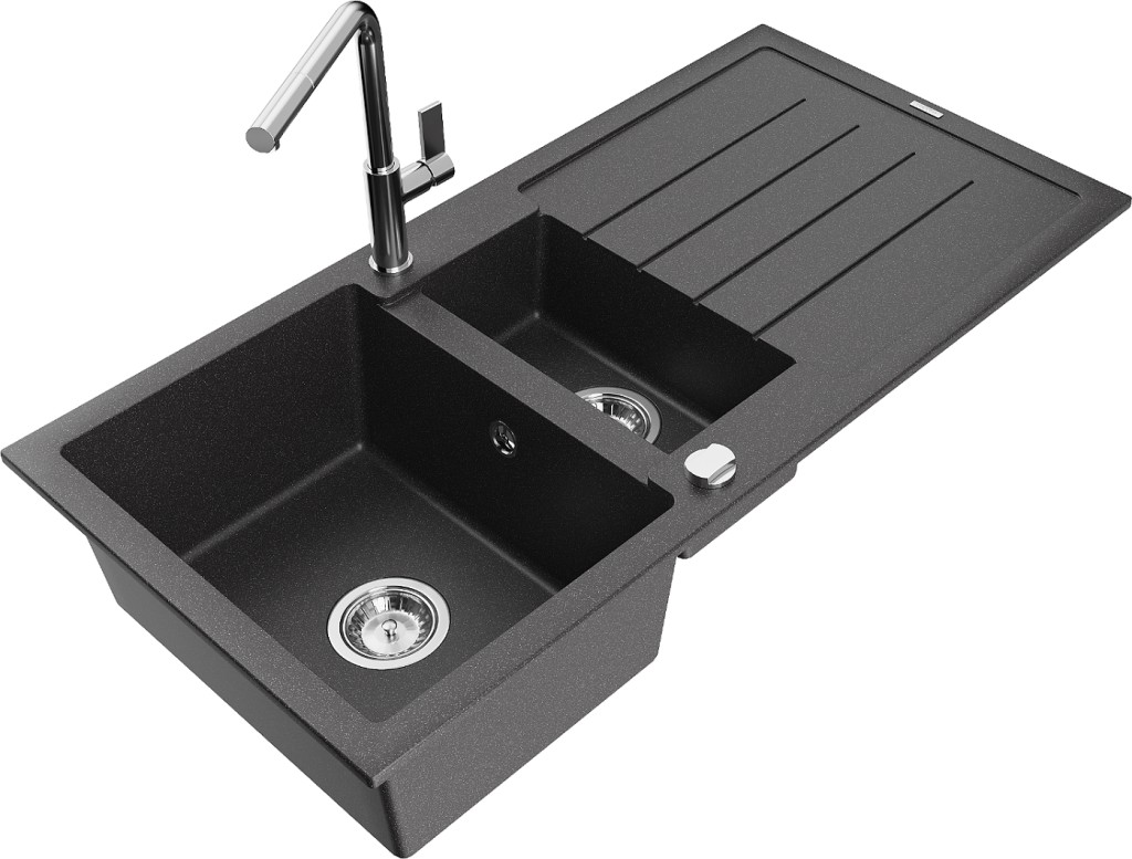 Technické dáta: Drez: Rozmer: 1000x500x200 mm Hĺbka komory: 190 mm (väčšia), 115 mm (menšia) Rozmery komory: 430x330 mm (väčšie), 340x170 mm (menšie) Priemer odtoku: ø90 mm Typ: 1,5-miska s odkvapkávačom Typ: Zapustené do pracovnej dosky Farba: Škvrnitá čierna Povrchová úprava sifónu: Chrome Materiál: žula (80% žulové kamenivo 20% živice) Prepadový otvor: Áno Otvory: (batérie, automat) 2 Inštalácia: Univerzálna, je možné inštalovať s odkvapkávačom na ľavú alebo pravú stranu Vysoká odolnosť proti poškriabaniu a zmene farby Odolnosť proti tepelným šokom Povrch pre ľahké čistenie Dva dodatočné vyfrézované otvory na samodierovanie ø35 Kuchynská batéria: Materiál: mosadz Farba: Chrome Hlava: Keramická Perlátor: Áno Typ: Jednopákové Rozsah výtoku: 245 mm Výška batérie: 307 mm(GT) Ean: 5905315062291