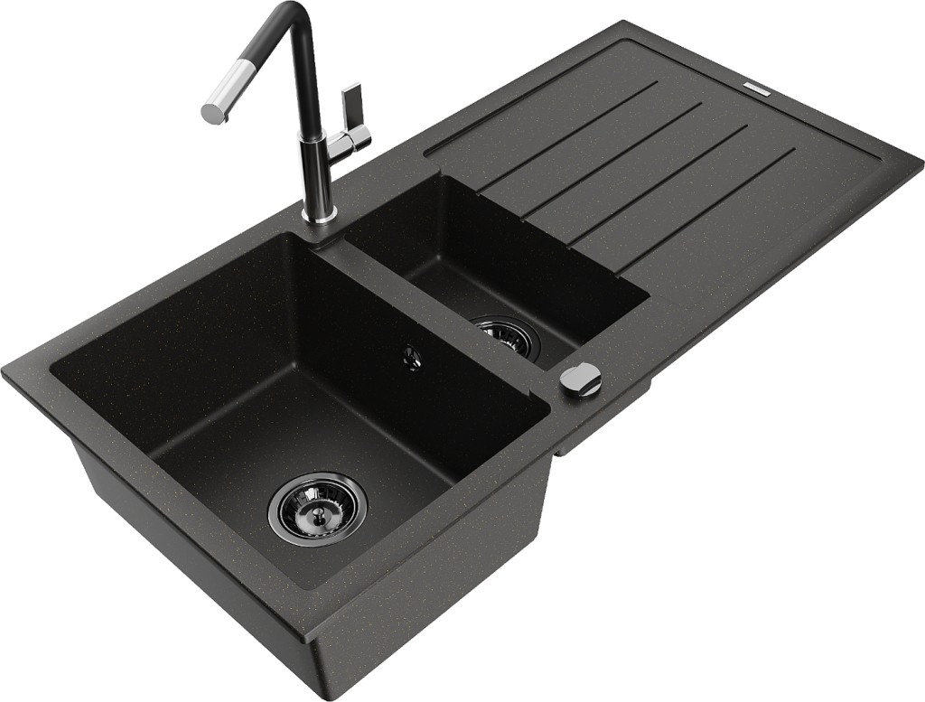 Technické dáta: Drez: Rozmer: 1000x500x200 mm Hĺbka komory: 190 mm (väčšia), 115 mm (menšia) Rozmery komory: 430x330 mm (väčšie), 340x170 mm (menšie) Priemer odtoku: ø90 mm Typ: 1,5-miska s odkvapkávačom Typ: Zapustené do pracovnej dosky Farba: čierna / zlatá metalíza Povrchová úprava sifónu: čierna Materiál: žula (80% žulové kamenivo 20% živice) Prepadový otvor: Áno Otvory: (batérie, automat) 2 Inštalácia: Univerzálna, je možné inštalovať s odkvapkávačom na ľavú alebo pravú stranu Vysoká odolnosť proti poškriabaniu a zmene farby Odolnosť proti tepelným šokom Povrch pre ľahké čistenie Dva dodatočné vyfrézované otvory na samodierovanie ø35 Kuchynská batéria: Materiál: mosadz Farba: chróm/čierna Hlava: Keramická Perlátor: Áno Typ: Jednopákové Rozsah výtoku: 245 mm Výška batérie: 307 mm(GT) Ean: 5905315062253