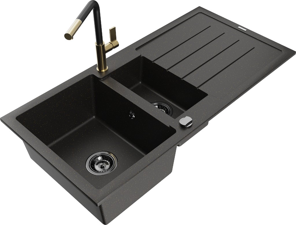 Technické dáta: Drez: Rozmer: 1000x500x200 mm Hĺbka komory: 190 mm (väčšia), 115 mm (menšia) Rozmery komory: 430x330 mm (väčšie), 340x170 mm (menšie) Priemer odtoku: ø90 mm Typ: 1,5-miska s odkvapkávačom Typ: Zapustené do pracovnej dosky Farba: čierna / zlatá metalíza Povrchová úprava sifónu: čierna Materiál: žula (80% žulové kamenivo 20% živice) Prepadový otvor: Áno Otvory: (batérie, automat) 2 Inštalácia: Univerzálna, je možné inštalovať s odkvapkávačom na ľavú alebo pravú stranu Vysoká odolnosť proti poškriabaniu a zmene farby Odolnosť proti tepelným šokom Povrch pre ľahké čistenie Dva dodatočné vyfrézované otvory na samodierovanie ø35 Kuchynská batéria: Materiál: mosadz Farba: Zlatá/Čierna Hlava: Keramická Perlátor: Áno Typ: Jednopákové Rozsah výtoku: 245 mm Výška batérie: 307 mm(GT) Ean: 5905315062277