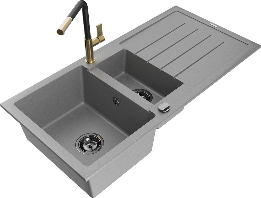 Technické dáta: Drez: Rozmer: 1000x500x200 mm Hĺbka komory: 190 mm (väčšia), 115 mm (menšia) Rozmery komory: 430x330 mm (väčšie), 340x170 mm (menšie) Priemer odtoku: ø90 mm Typ: 1,5-miska s odkvapkávačom Typ: Zapustené do pracovnej dosky Šedá farba Povrchová úprava sifónu: čierna Materiál: žula (80% žulové kamenivo 20% živice) Prepadový otvor: Áno Otvory: (batérie, automat) 2 Inštalácia: Univerzálna, je možné inštalovať s odkvapkávačom na ľavú alebo pravú stranu Vysoká odolnosť proti poškriabaniu a zmene farby Odolnosť proti tepelným šokom Povrch pre ľahké čistenie Dva dodatočné vyfrézované otvory na samodierovanie ø35 Kuchynská batéria: Materiál: mosadz Farba: Zlatá/Čierna Hlava: Keramická Perlátor: Áno Typ: Jednopáková Rozsah výtoku: 245 mm Výška batérie: 307 mm(GT) Ean: 5905315062154