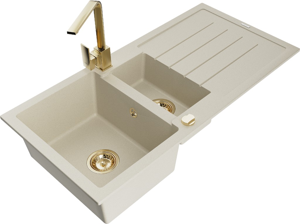 Technické dáta: Drez: Rozmer: 1000x500x200 mm Hĺbka komory: 190 mm (väčšia), 115 mm (menšia) Rozmery komory: 430x330 mm (väčšie), 340x170 mm (menšie) Priemer odtoku: ø90 mm Typ: 1,5-miska s odkvapkávačom Typ: Zapustené do pracovnej dosky Farba béžová Povrchová úprava sifónu: zlatá Materiál: žula (80% žulové kamenivo 20% živice) Prepadový otvor: Áno Otvory: (batérie, automat) 2 Inštalácia: Univerzálna, je možné inštalovať s odkvapkávačom na ľavú alebo pravú stranu Vysoká odolnosť proti poškriabaniu a zmene farby Odolnosť proti tepelným šokom Povrch pre ľahké čistenie Dva dodatočné vyfrézované otvory na samodierovanie ø35 Kuchynská batéria: Materiál: mosadz Farba: Zlatá Hlava: Keramická Perlátor: Áno Typ: Jednopáková Výška batérie: 290 mm Rozsah výtoku: 220 mm(GT) Ean: 5905315020796