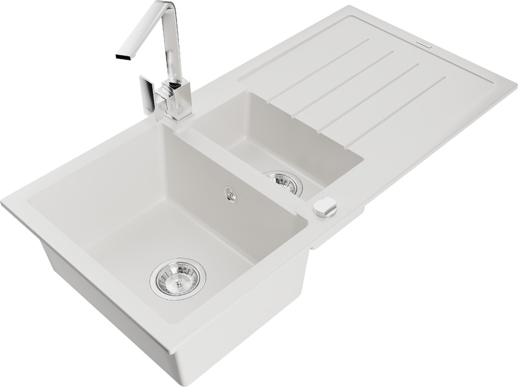 Technické údaje: Kuchynský drez: Rozmer: 1000x500x200 mm Hĺbka komory: 190 mm (väčšia), 115 mm (menšia) Rozmery komory: 430x330 mm (väčšie), 340x170 mm (menšie) Priemer odtoku: ø90 mm Typ: 1,5-miska s odkvapkávačom Typ: Zapustené do pracovnej dosky Farba: Biela Povrchová úprava sifónu: Chrome Materiál: žula (80% žulové kamenivo 20% živice) Prepadový otvor: Áno Otvory: (batérie, automat) 2 Inštalácia: Univerzálna, je možné inštalovať s odkvapkávačom na ľavú alebo pravú stranu Vysoká odolnosť proti poškriabaniu a zmene farby Odolnosť proti tepelným šokom Povrch pre ľahké čistenie Dva dodatočné vyfrézované otvory na samodierovanie ø35 Kuchynská batéria: Materiál: mosadz Farba: Chrome Hlava: Keramická Perlátor: Áno Typ: Jednopákové Výška batérie: 290 mm Rozsah výtoku: 220 mm(GT) Ean: 5905315020734