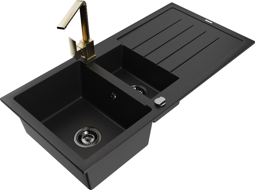 Technické dáta: Drez: Rozmer: 1000x500x200 mm Hĺbka komory: 190 mm (väčšia), 115 mm (menšia) Rozmery komory: 430x330 mm (väčšie), 340x170 mm (menšie) Priemer odtoku: ø90 mm Typ: 1,5-miska s odkvapkávačom Typ: Zapustené do pracovnej dosky Farba: čierna / zlatá metalíza Povrchová úprava sifónu: čierna Materiál: žula (80% žulové kamenivo 20% živice) Prepadový otvor: Áno Otvory: (batérie, automat) 2 Inštalácia: Univerzálna, je možné inštalovať s odkvapkávačom na ľavú alebo pravú stranu Vysoká odolnosť proti poškriabaniu a zmene farby Odolnosť proti tepelným šokom Povrch pre ľahké čistenie Dva dodatočné vyfrézované otvory na samodierovanie ø35 Kuchynská batéria: Materiál: mosadz Farba: Zlatá Hlava: Keramická Perlátor: Áno Typ: Jednopákové Výška batérie: 290 mm Rozsah výtoku: 220 mm(GT) Ean: 5905315020925