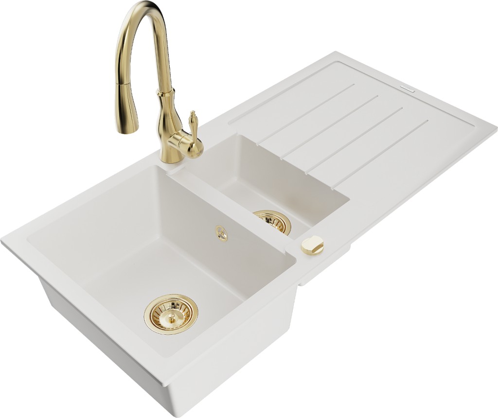 Technické údaje: Kuchynský drez: Rozmer: 1000x500x200 mm Hĺbka komory: 190 mm (väčšia), 115 mm (menšia) Rozmery komory: 430x330 mm (väčšie), 340x170 mm (menšie) Priemer odtoku: ø90 mm Typ: 1,5-miska s odkvapkávačom Typ: Zapustené do pracovnej dosky Farba: Biela Povrchová úprava sifónu: zlatá Materiál: žula (80% žulové kamenivo 20% živice) Prepadový otvor: Áno Otvory: (batérie, automat) 2 Inštalácia: Univerzálna, je možné inštalovať s odkvapkávačom na ľavú alebo pravú stranu Vysoká odolnosť proti poškriabaniu a zmene farby Odolnosť proti tepelným šokom Povrch pre ľahké čistenie Dva dodatočné vyfrézované otvory na samodierovanie ø35 Kuchynská batéria: Materiál: mosadz Farba: Zlatá Hlava: Keramická Perlátor: Áno Typ: Jednopáková Výška batérie: 410 mm Rozsah výtoku: 231 mm(GT) Ean: 5905315036100