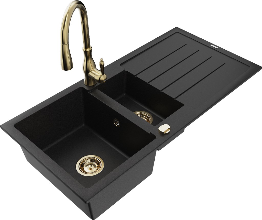 Technické dáta: Drez: Rozmer: 1000x500x200 mm Hĺbka komory: 190 mm (väčšia), 115 mm (menšia) Rozmery komory: 430x330 mm (väčšie), 340x170 mm (menšie) Priemer odtoku: ø90 mm Typ: 1,5-miska s odkvapkávačom Typ: Zapustené do pracovnej dosky Čierna farba Povrchová úprava sifónu: zlatá Materiál: žula (80% žulové kamenivo 20% živice) Prepadový otvor: Áno Otvory: (batérie, automat) 2 Inštalácia: Univerzálna, je možné inštalovať s odkvapkávačom na ľavú alebo pravú stranu Vysoká odolnosť proti poškriabaniu a zmene farby Odolnosť proti tepelným šokom Povrch pre ľahké čistenie Dva dodatočné vyfrézované otvory na samodierovanie ø35 Kuchynská batéria: Materiál: mosadz Farba: Zlatá Hlava: Keramická Perlátor: Áno Typ: Jednopákové Výška batérie: 410 mm Rozsah výtoku: 231 mm(GT) Ean: 5905315036360