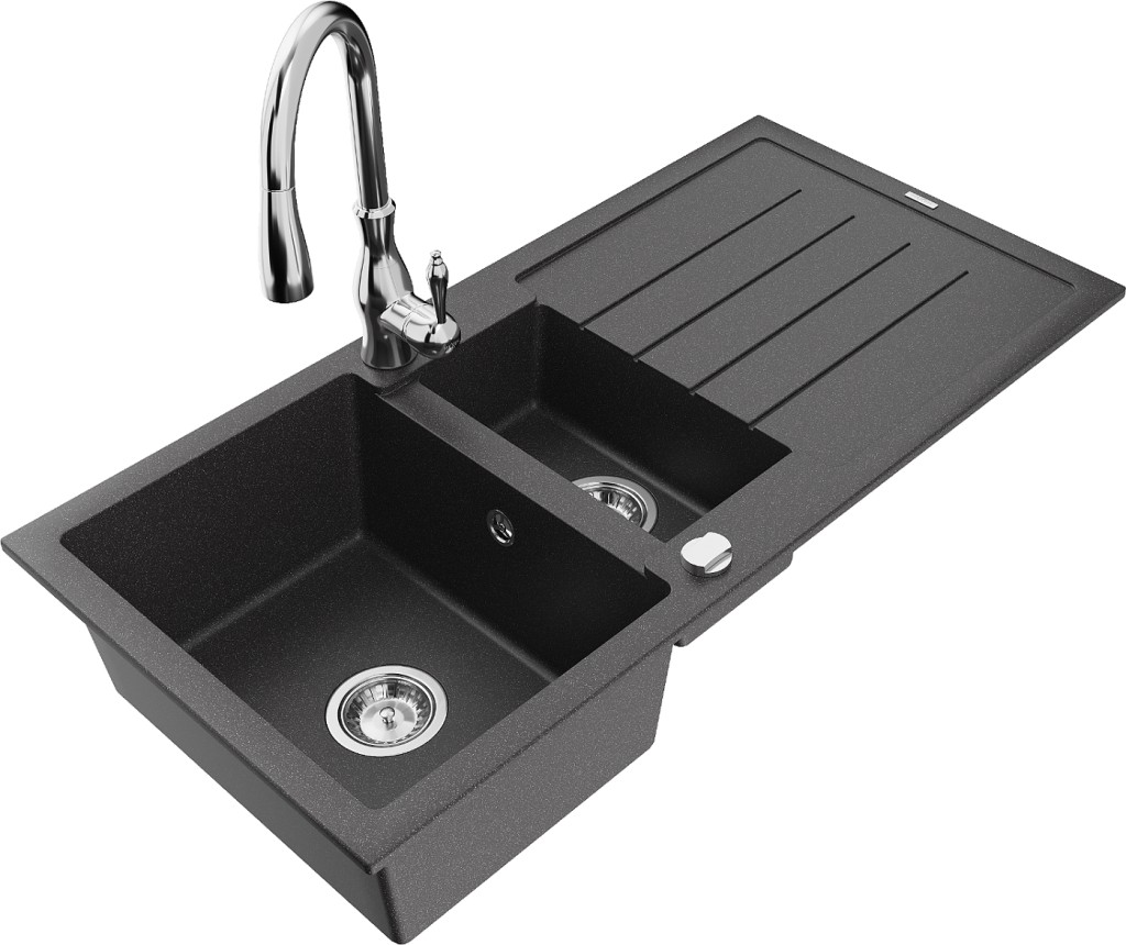 Technické dáta: Drez: Rozmer: 1000x500x200 mm Hĺbka komory: 190 mm (väčšia), 115 mm (menšia) Rozmery komory: 430x330 mm (väčšie), 340x170 mm (menšie) Priemer odtoku: ø90 mm Typ: 1,5-miska s odkvapkávačom Typ: Zapustené do pracovnej dosky Farba: Škvrnitá čierna Povrchová úprava sifónu: Chrome Materiál: žula (80% žulové kamenivo 20% živice) Prepadový otvor: Áno Otvory: (batérie, automat) 2 Inštalácia: Univerzálna, je možné inštalovať s odkvapkávačom na ľavú alebo pravú stranu Vysoká odolnosť proti poškriabaniu a zmene farby Odolnosť proti tepelným šokom Povrch pre ľahké čistenie Dva dodatočné vyfrézované otvory na samodierovanie ø35 Kuchynská batéria: Materiál: mosadz Farba: Chrome Hlava: Keramická Perlátor: Áno Typ: Jednopákové Výška batérie: 410 mm Rozsah výtoku: 231 mm(GT) Ean: 5905315036308