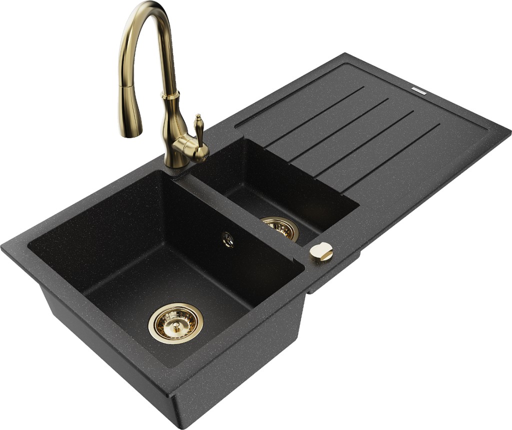 Technické dáta: Drez: Rozmer: 1000x500x200 mm Hĺbka komory: 190 mm (väčšia), 115 mm (menšia) Rozmery komory: 430x330 mm (väčšie), 340x170 mm (menšie) Priemer odtoku: ø90 mm Typ: 1,5-miska s odkvapkávačom Typ: Zapustené do pracovnej dosky Farba: čierna/strieborná metalíza Povrchová úprava sifónu: zlatá Materiál: žula (80% žulové kamenivo 20% živice) Prepadový otvor: Áno Otvory: (batérie, automat) 2 Inštalácia: Univerzálna, je možné inštalovať s odkvapkávačom na ľavú alebo pravú stranu Vysoká odolnosť proti poškriabaniu a zmene farby Odolnosť proti tepelným šokom Povrch pre ľahké čistenie Dva dodatočné vyfrézované otvory na samodierovanie ø35 Kuchynská batéria: Materiál: mosadz Farba: Zlatá Hlava: Keramická Perlátor: Áno Typ: Jednopákové Výška batérie: 410 mm Rozsah výtoku: 231 mm(GT) Ean: 5905315036223