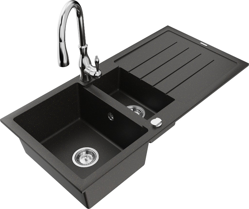 Technické dáta: Drez: Rozmer: 1000x500x200 mm Hĺbka komory: 190 mm (väčšia), 115 mm (menšia) Rozmery komory: 430x330 mm (väčšie), 340x170 mm (menšie) Priemer odtoku: ø90 mm Typ: 1,5-miska s odkvapkávačom Typ: Zapustené do pracovnej dosky Farba: čierna / zlatá metalíza Povrchová úprava sifónu: Chrome Materiál: žula (80% žulové kamenivo 20% živice) Prepadový otvor: Áno Otvory: (batérie, automat) 2 Inštalácia: Univerzálna, je možné inštalovať s odkvapkávačom na ľavú alebo pravú stranu Vysoká odolnosť proti poškriabaniu a zmene farby Odolnosť proti tepelným šokom Povrch pre ľahké čistenie Dva dodatočné vyfrézované otvory na samodierovanie ø35 Kuchynská batéria: Materiál: mosadz Farba: Chrome Hlava: Keramická Perlátor: Áno Typ: Jednopákové Výška batérie: 410 mm Rozsah výtoku: 231 mm(GT) Ean: 5905315036254
