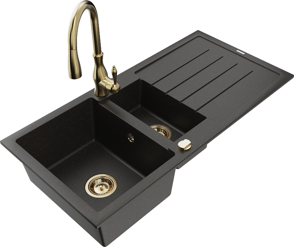 Technické dáta: Drez: Rozmer: 1000x500x200 mm Hĺbka komory: 190 mm (väčšia), 115 mm (menšia) Rozmery komory: 430x330 mm (väčšie), 340x170 mm (menšie) Priemer odtoku: ø90 mm Typ: 1,5-miska s odkvapkávačom Typ: Zapustené do pracovnej dosky Farba: čierna / zlatá metalíza Povrchová úprava sifónu: zlatá Materiál: žula (80% žulové kamenivo 20% živice) Prepadový otvor: Áno Otvory: (batérie, automat) 2 Inštalácia: Univerzálna, je možné inštalovať s odkvapkávačom na ľavú alebo pravú stranu Vysoká odolnosť proti poškriabaniu a zmene farby Odolnosť proti tepelným šokom Povrch pre ľahké čistenie Dva dodatočné vyfrézované otvory na samodierovanie ø35 Kuchynská batéria: Materiál: mosadz Farba: Zlatá Hlava: Keramická Perlátor: Áno Typ: Jednopákové Výška batérie: 410 mm Rozsah výtoku: 231 mm(GT) Ean: 5905315036261
