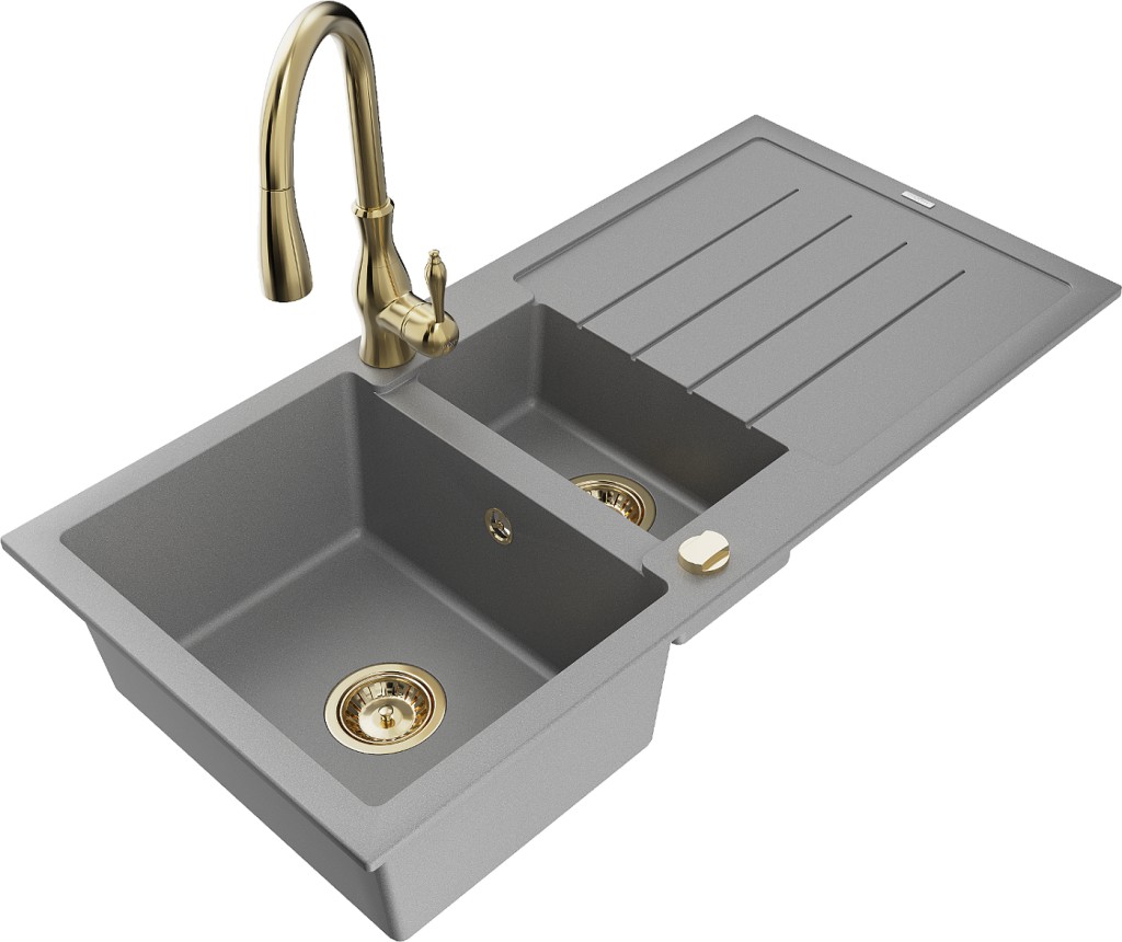 Technické dáta: Drez: Rozmer: 1000x500x200 mm Hĺbka komory: 190 mm (väčšia), 115 mm (menšia) Rozmery komory: 430x330 mm (väčšie), 340x170 mm (menšie) Priemer odtoku: ø90 mm Typ: 1,5-miska s odkvapkávačom Typ: Zapustené do pracovnej dosky Šedá farba Povrchová úprava sifónu: zlatá Materiál: žula (80% žulové kamenivo 20% živice) Prepadový otvor: Áno Otvory: (batérie, automat) 2 Inštalácia: Univerzálna, je možné inštalovať s odkvapkávačom na ľavú alebo pravú stranu Vysoká odolnosť proti poškriabaniu a zmene farby Odolnosť proti tepelným šokom Povrch pre ľahké čistenie Dva dodatočné vyfrézované otvory na samodierovanie ø35 Kuchynská batéria: Materiál: mosadz Farba: Zlatá Hlava: Keramická Perlátor: Áno Typ: Jednopákové Výška batérie: 410 mm Rozsah výtoku: 231 mm(GT) Ean: 5905315036179