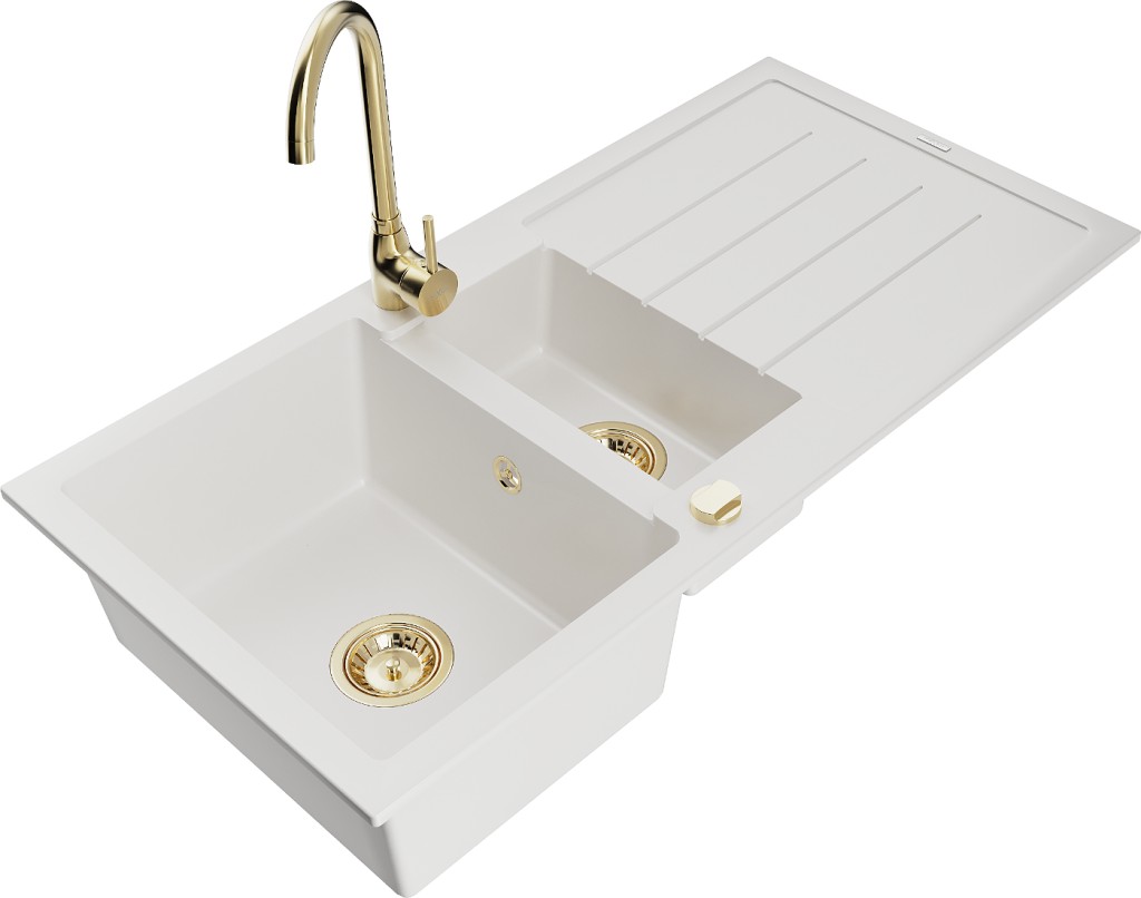 Špecifikácia produktu: Kuchynský drez: Rozmer: 1000x500x200 mm Hĺbka komory: 190 mm (väčšia), 115 mm (menšia) Rozmery komory: 430x330 mm (väčšie), 340x170 mm (menšie) Priemer odtoku: ø90 mm Typ: 1,5-miska s odkvapkávačom Typ: Zapustené do pracovnej dosky Farba: Biela Materiál: žula (80% žulové kamenivo 20% živice) Prepadový otvor: Áno Otvory: (batérie, automat) 2 Inštalácia: Univerzálna, je možné inštalovať s odkvapkávačom na ľavú alebo pravú stranu Vysoká odolnosť proti poškriabaniu a zmene farby Odolnosť proti tepelným šokom Povrch pre ľahké čistenie Dva dodatočné vyfrézované otvory na samodierovanie ø35 Kuchynská batéria: Materiál: mosadz Farba: Zlatá Hlava: Keramická Perlátor: Áno Výška batérie: 335 mm Rozsah výtoku: 180 mm(GT) Ean: 5907709160934