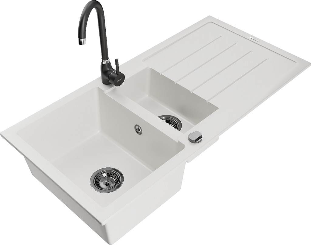 Technické údaje: Kuchynský drez: Rozmer: 1000x500x200 mm Hĺbka komory: 190 mm (väčšia), 115 mm (menšia) Rozmery komory: 430x330 mm (väčšie), 340x170 mm (menšie) Priemer odtoku: ø90 mm Typ: 1,5-miska s odkvapkávačom Typ: Zapustené do pracovnej dosky Farba: Biela Povrchová úprava sifónu: čierna Materiál: žula (80% žulové kamenivo 20% živice) Prepadový otvor: Áno Otvory: (batérie, automat) 2 Inštalácia: Univerzálna, je možné inštalovať s odkvapkávačom na ľavú alebo pravú stranu Vysoká odolnosť proti poškriabaniu a zmene farby Odolnosť proti tepelným šokom Povrch pre ľahké čistenie Dva dodatočné vyfrézované otvory na samodierovanie ø35 Kuchynská batéria: Materiál: mosadz Farba: Čierna Hlava: Keramická Perlátor: Áno Typ: Jednopákové Výška batérie: 335 mm Rozsah výtoku: 180 mm(GT) Ean: 5905315015761